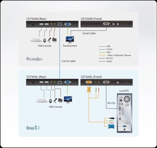 Le port RS‑232 intégré sur l’unité locale et distante permet la configuration série et la connexion d’appareils tels que les écrans tactiles ou les lecteurs de codes-barres. La solution est idéale pour les environnements industriels, les halls de production ou les chantiers, où vous avez besoin d’une console à portée de main et de l’ordinateur dans une zone protégée.