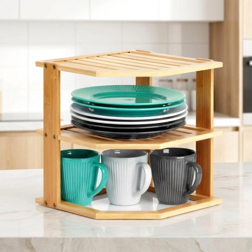 La structure d’angle compacte libère de la place sur le plan de travail et organise clairement la vaisselle ou les épices dans le coin du plan ou du placard.
