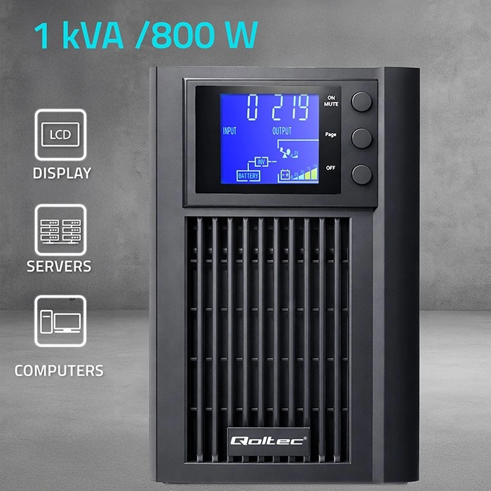 L’UPS Qoltec de 800 W fournit une alimentation continue et propre aux équipements sensibles – des serveurs et éléments réseau aux pompes et petits appareils. Grâce à l’onde sinusoïdale pure, l’alimentation est sûre même pour les dispositifs avec moteurs et PFC actif. L’AVR stabilise automatiquement la sortie sans basculer sur la batterie et l’écran LCD affiche clairement les paramètres clés.