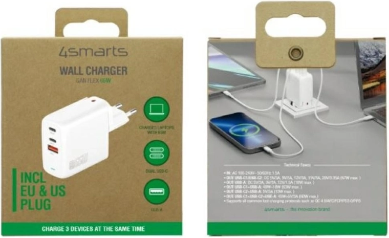 Profitez d’une puissance maximale dans un format minimal. La technologie GaN permet de réduire nettement la taille tout en conservant une excellente efficacité et un échauffement moindre. Le chargeur délivre jusqu’à 65 W via USB‑C, ce qui permet de recharger rapidement sans difficulté un ordinateur portable, une tablette et un smartphone. Grâce à ses trois ports, vous pouvez aisément alimenter plusieurs appareils en même temps.