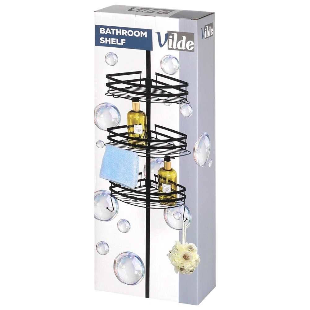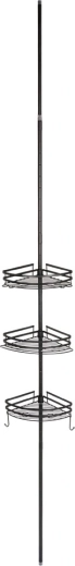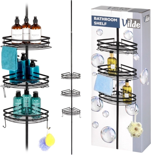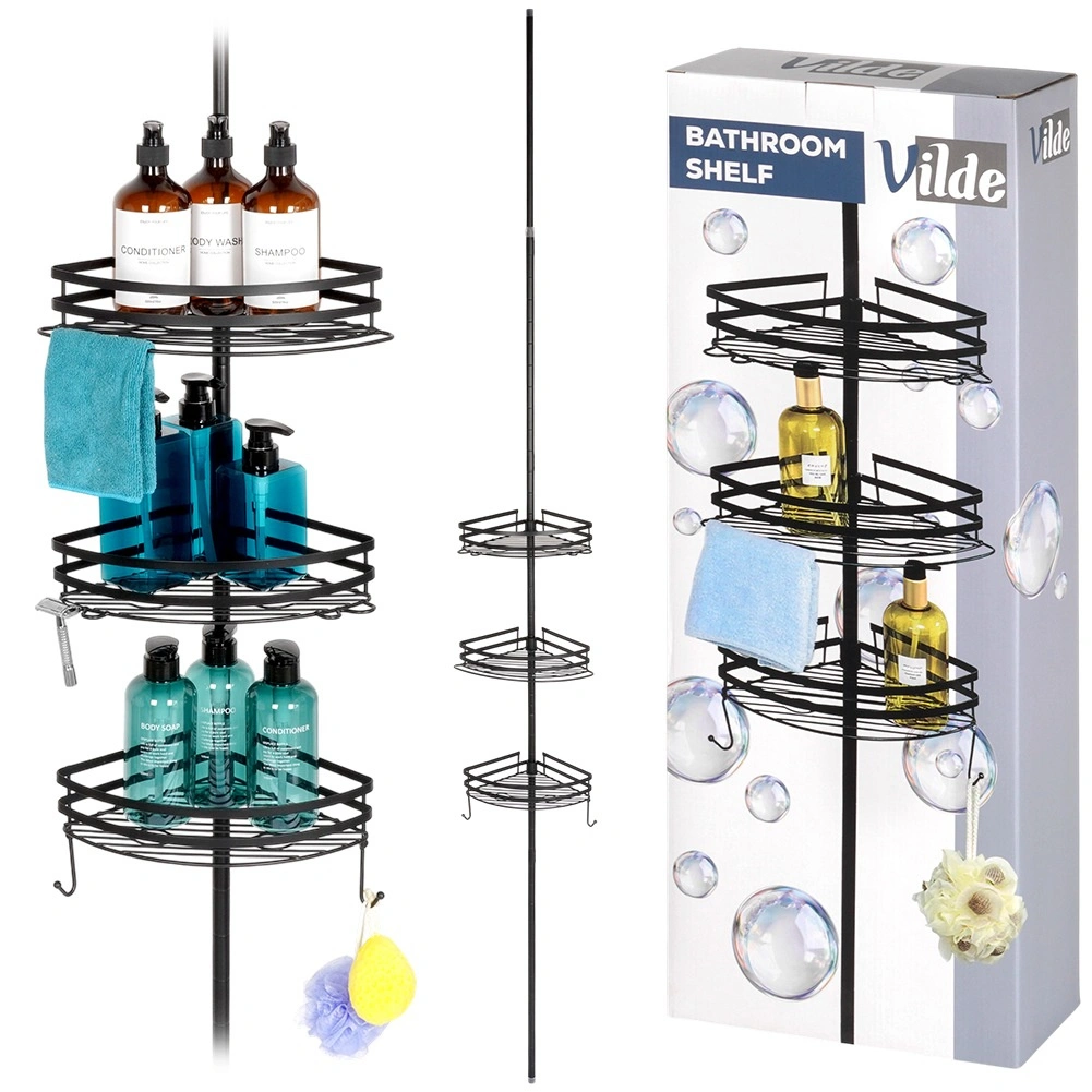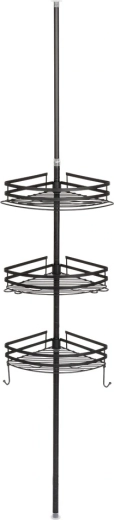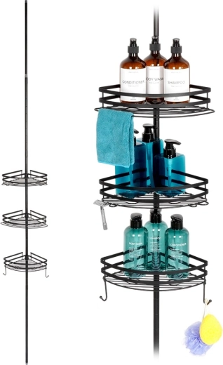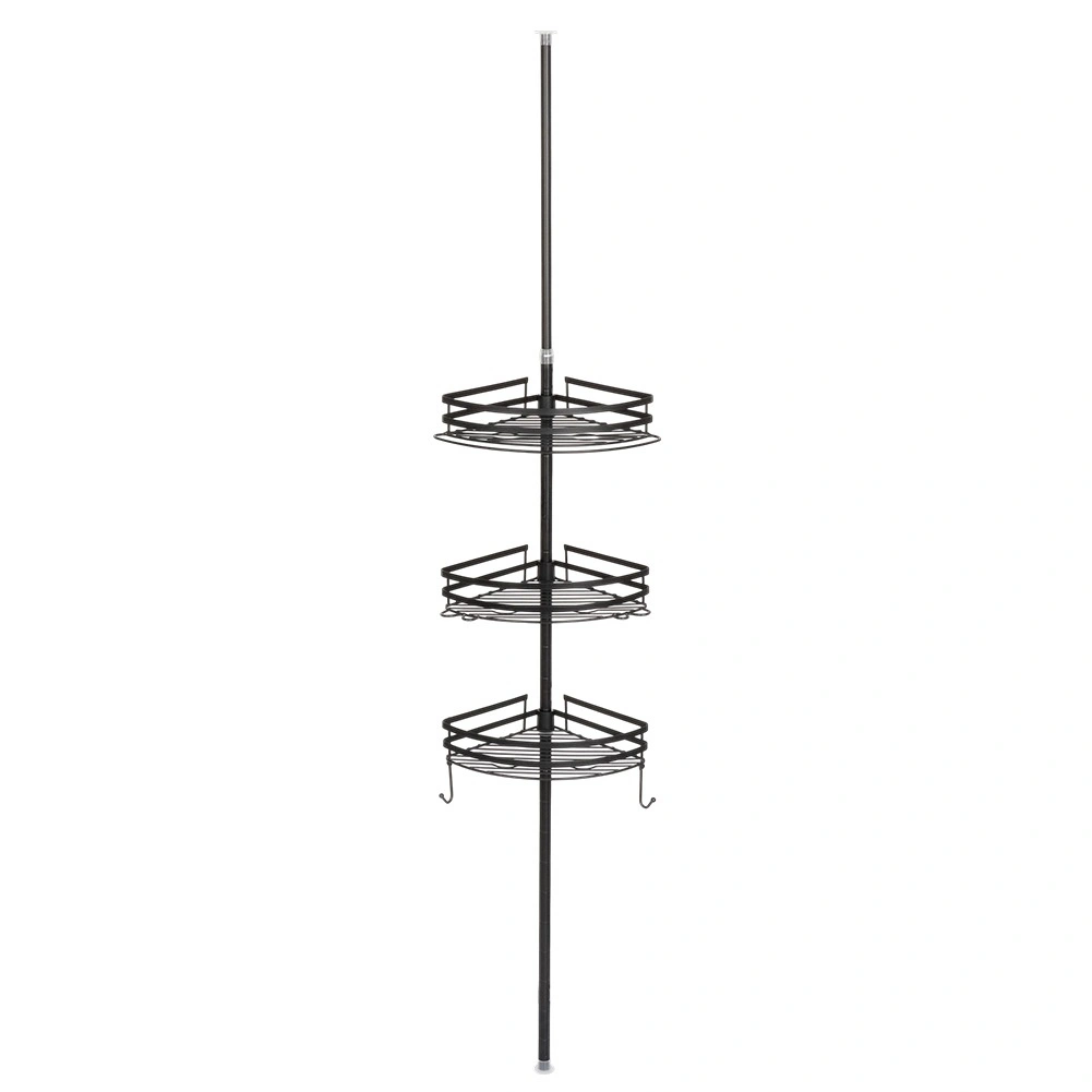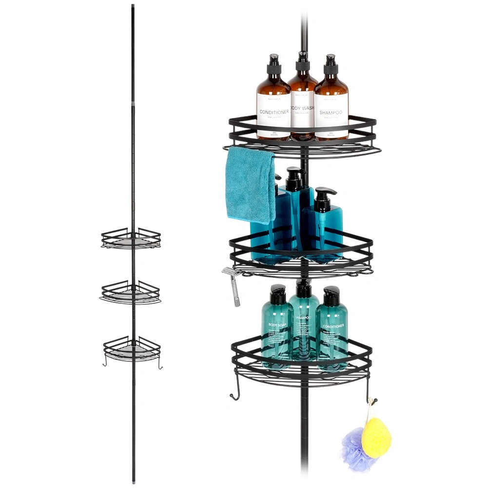 Pratique étagère de douche d’angle avec barre d’écartement télescopique sans perçage, offrant 3 paniers spacieux pour shampoings et cosmétiques. Structure tout métal noire mate résistante, hauteur réglable et écoulement rapide de l’eau grâce au fond en fil métallique pour garder ordre et sécheresse sous la douche comme au-dessus de la baignoire.