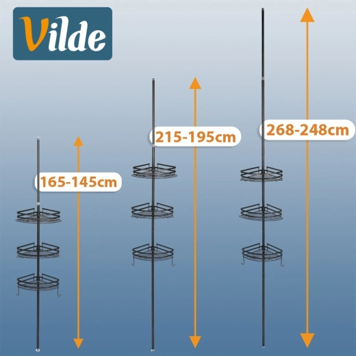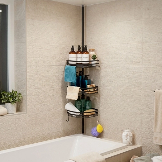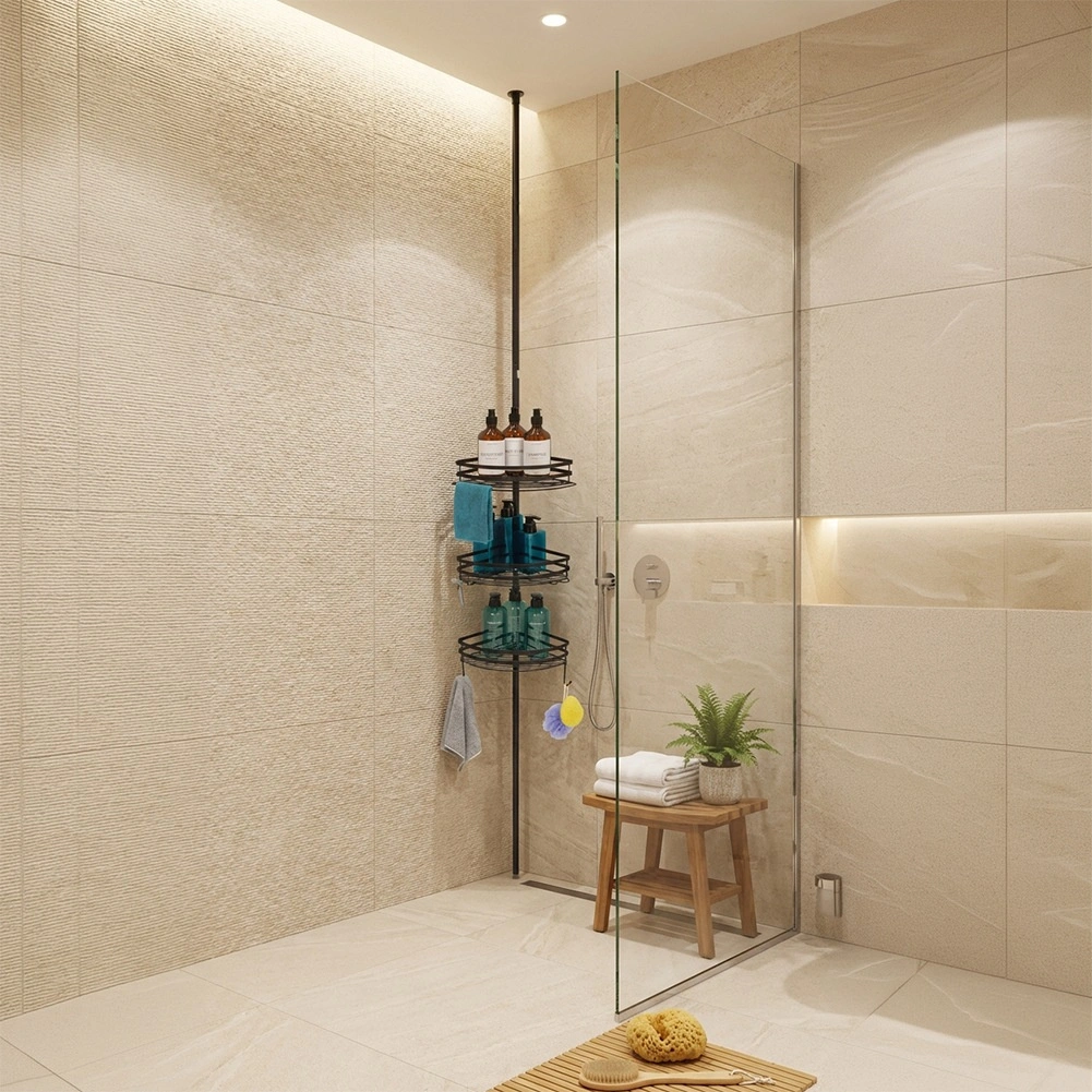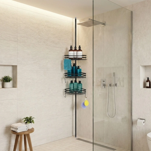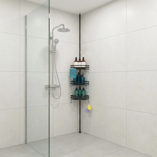 Organisez votre salle de bain avec style et fonctionnalité. Cette étagère de douche d’angle à barre télescopique se monte sans perçage – il suffit de la coincer entre le sol et le plafond. La hauteur réglable permet d’adapter précisément l’emplacement des paniers à votre douche ou salle de bain, tandis que la finition métal noir mat apporte un look moderne et une grande durabilité.