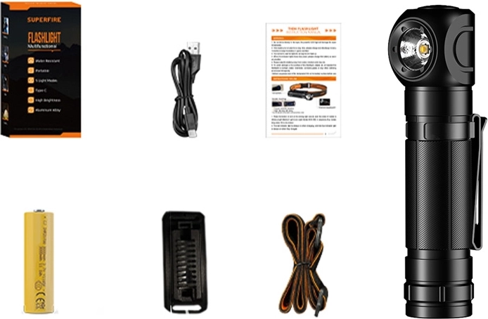 - Lampe, câble USB-C, batterie 18650, support de lampe, bandeau, manuel d’utilisation, emballage