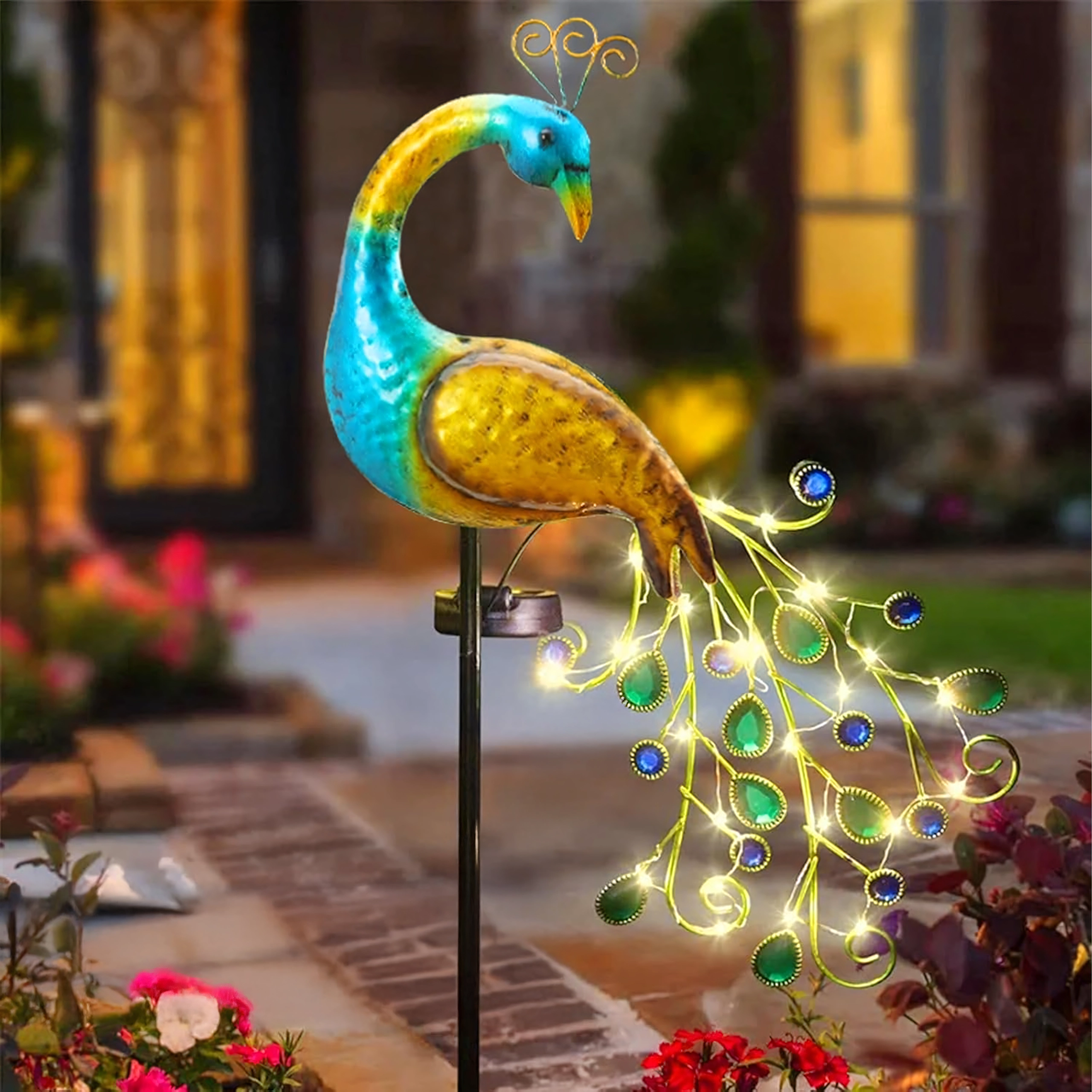 Donnez vie à votre jardin avec une élégante lampe solaire en forme de paon. Sa structure métallique colorée ornée de perles et de LED dans la queue crée une atmosphère douce à la tombée de la nuit. Grâce à l’alimentation solaire, elle s’allume automatiquement sans câbles, sa structure métallique résistante supporte les conditions extérieures et son pique de mise à la terre robuste assure une installation stable le long d’un chemin, d’un massif ou sur une terrasse.