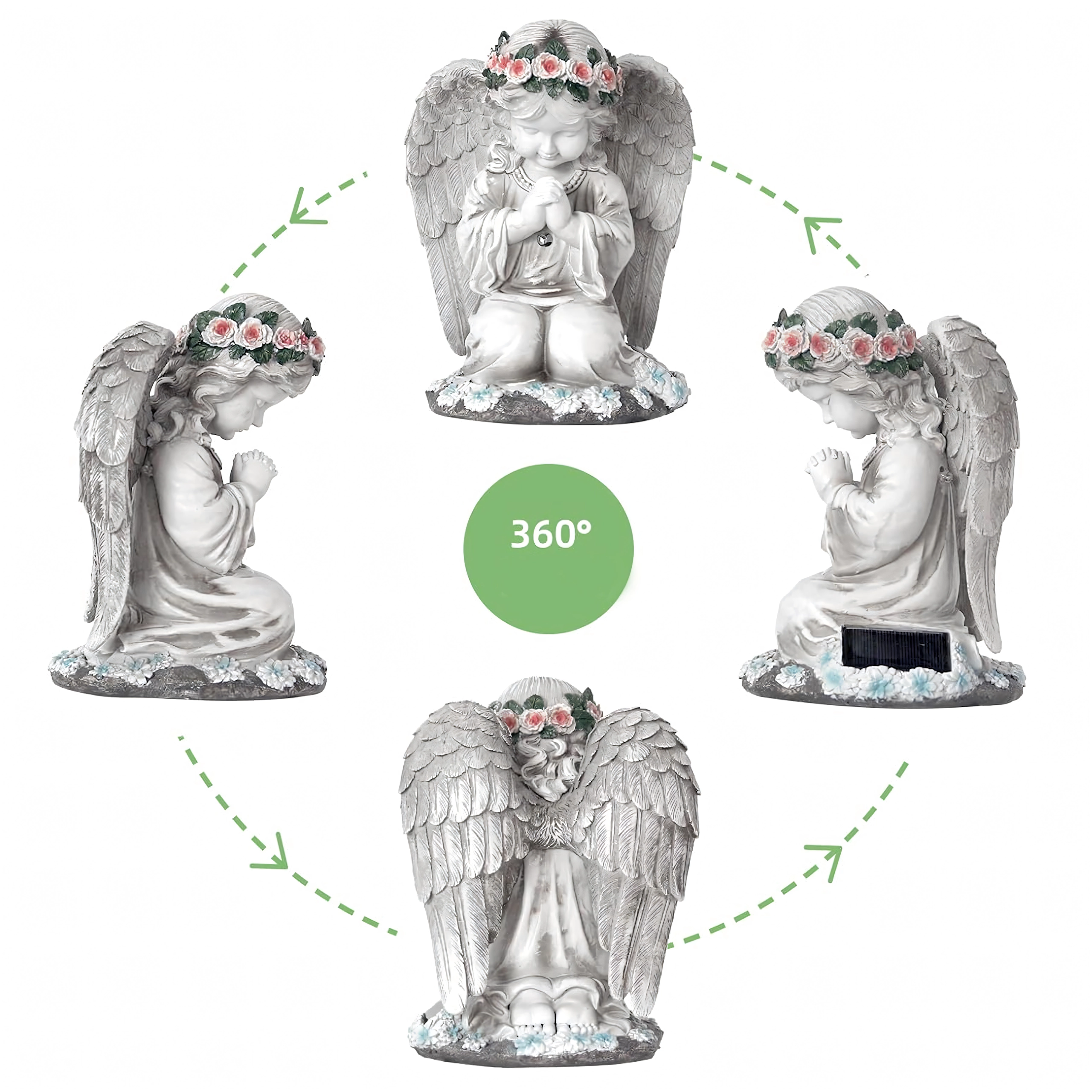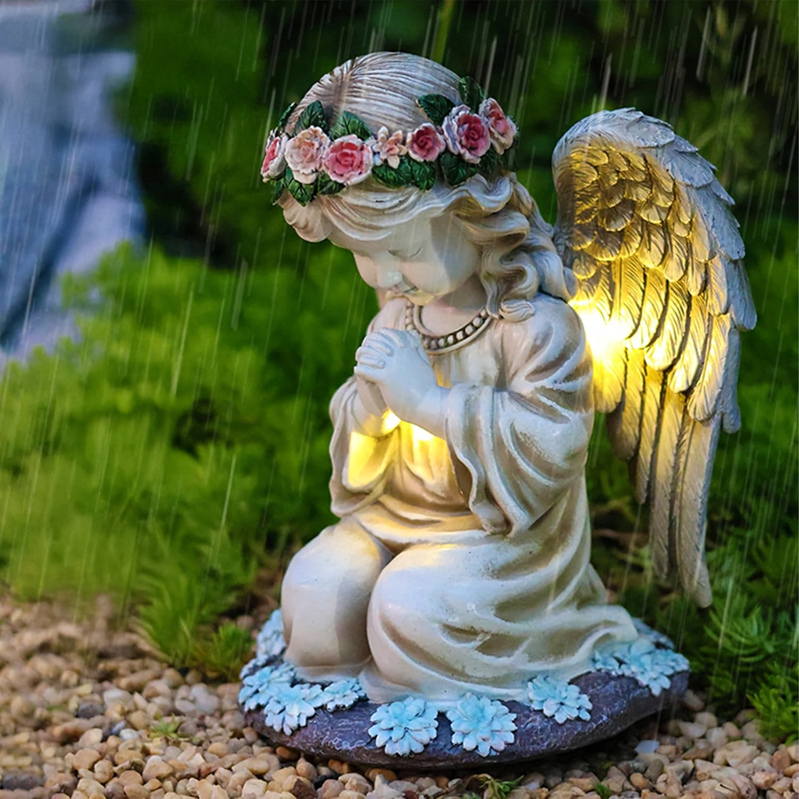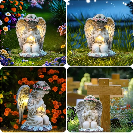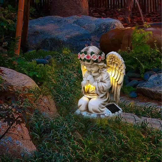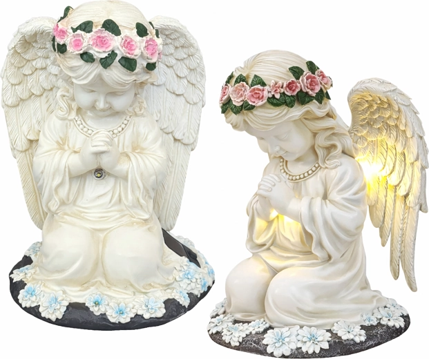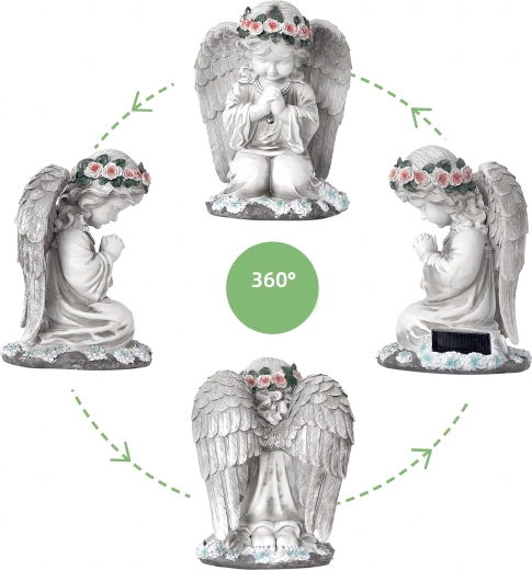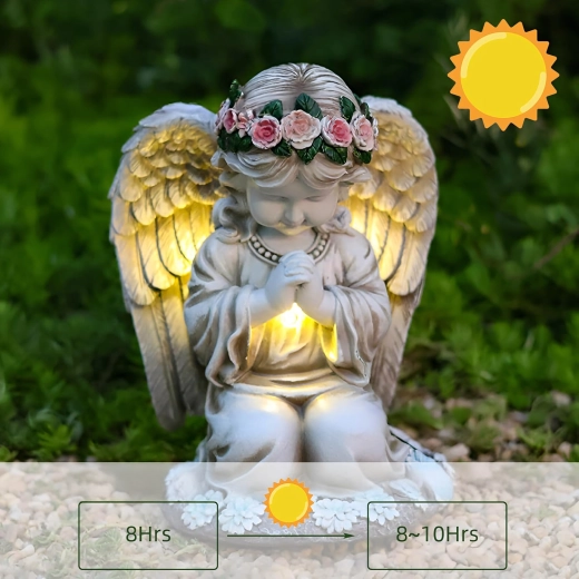 La structure en résine résistante, avec des détails réalistes de plumes et de fleurs, est résistante à la pluie, au vent et à la neige. La statuette est parfaite comme décoration de jardin, photophore discret ou lumière de mémoire au charme apaisant.
