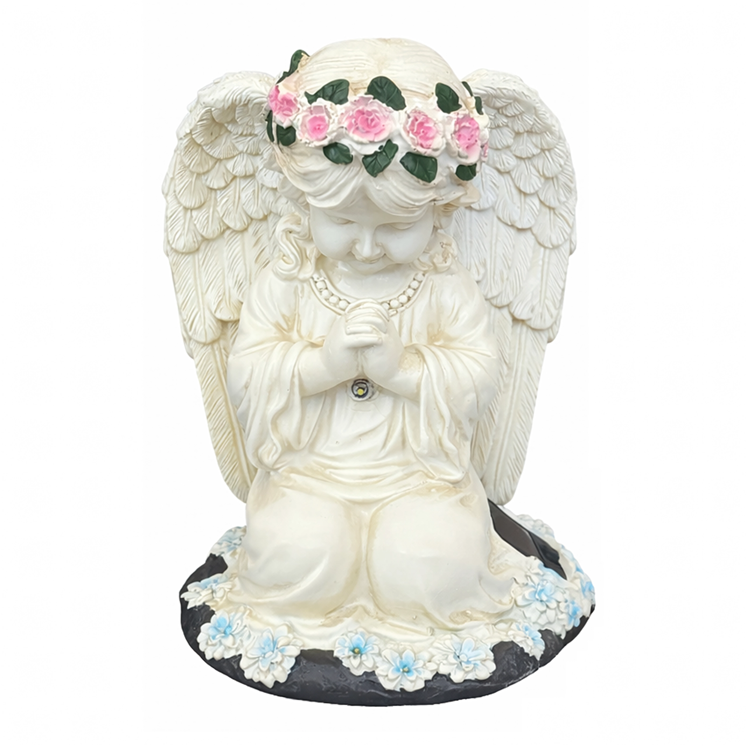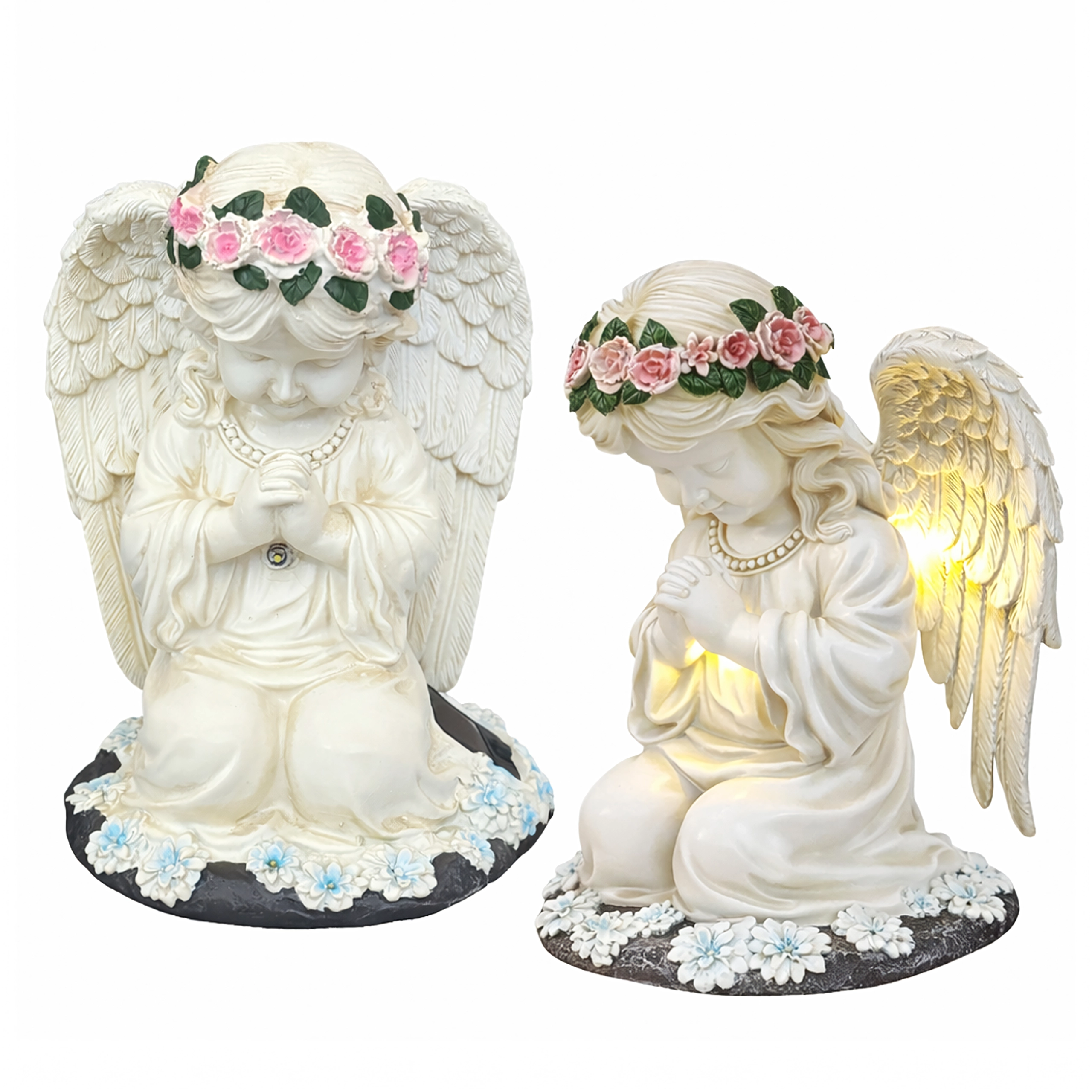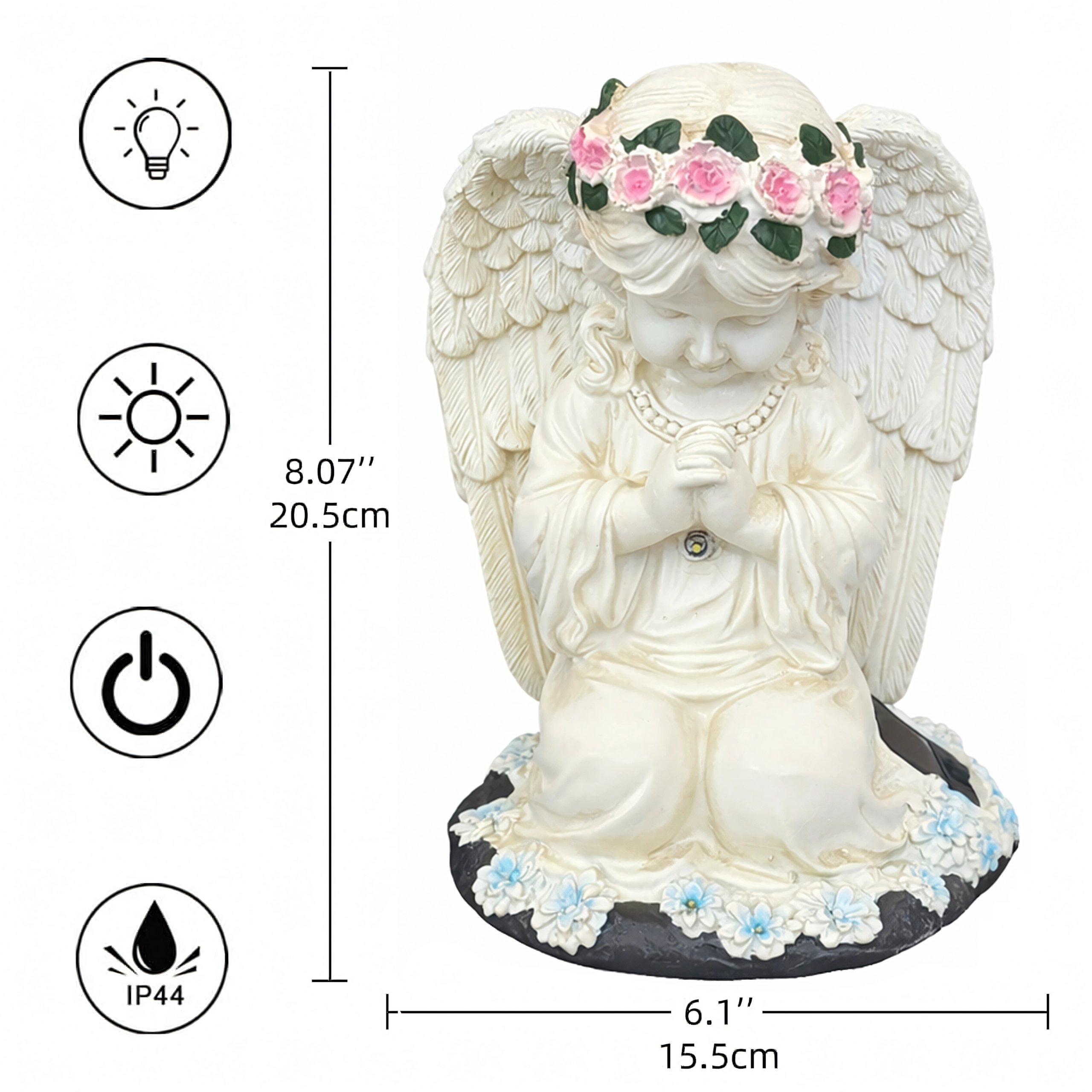 La structure en résine résistante, avec des détails réalistes de plumes et de fleurs, est résistante à la pluie, au vent et à la neige. La statuette est parfaite comme décoration de jardin, photophore discret ou lumière de mémoire au charme apaisant.