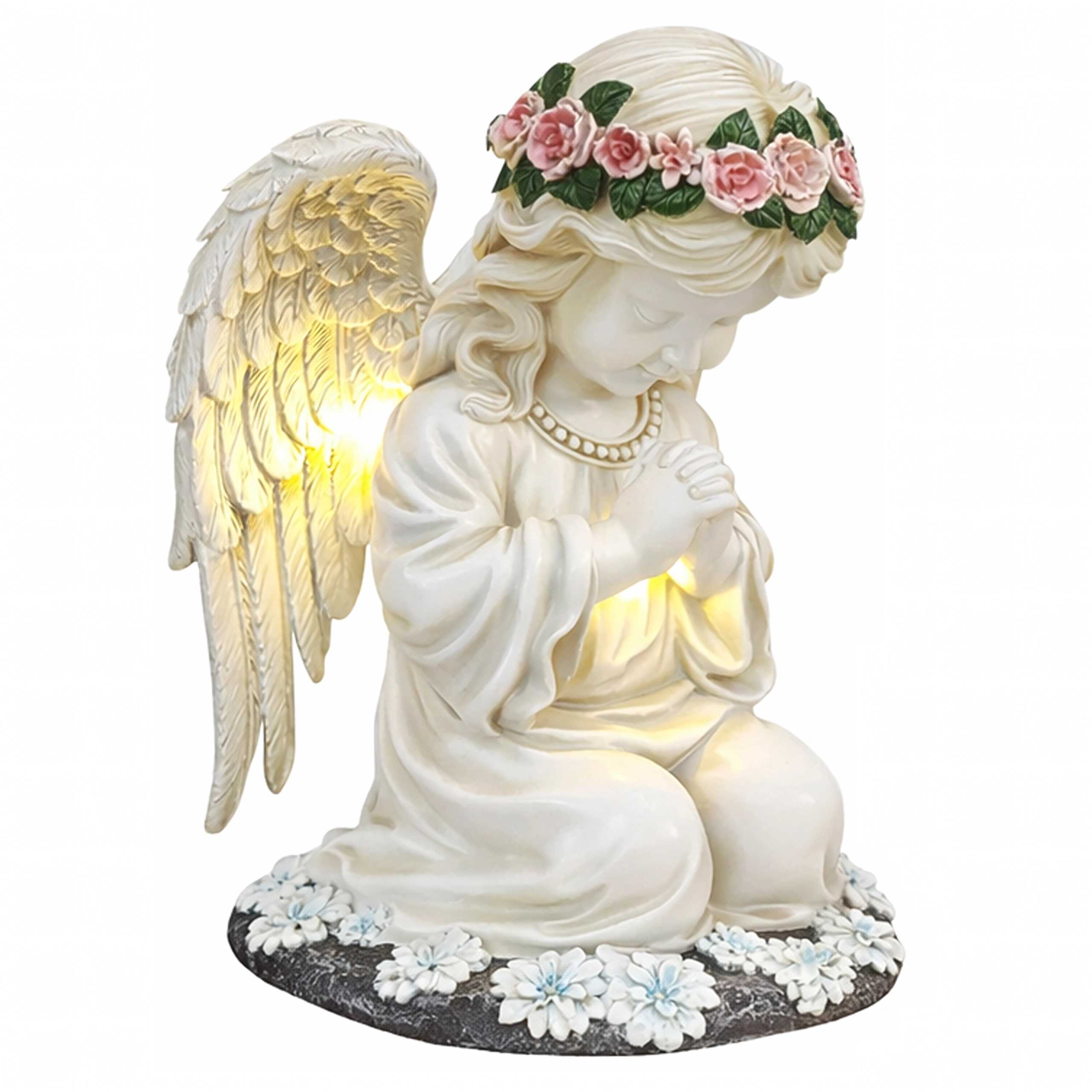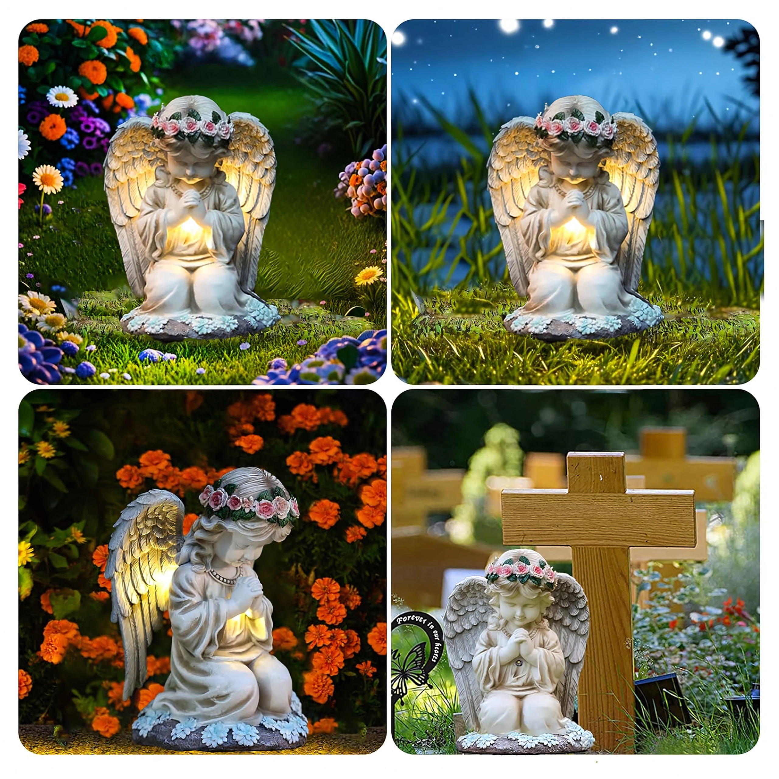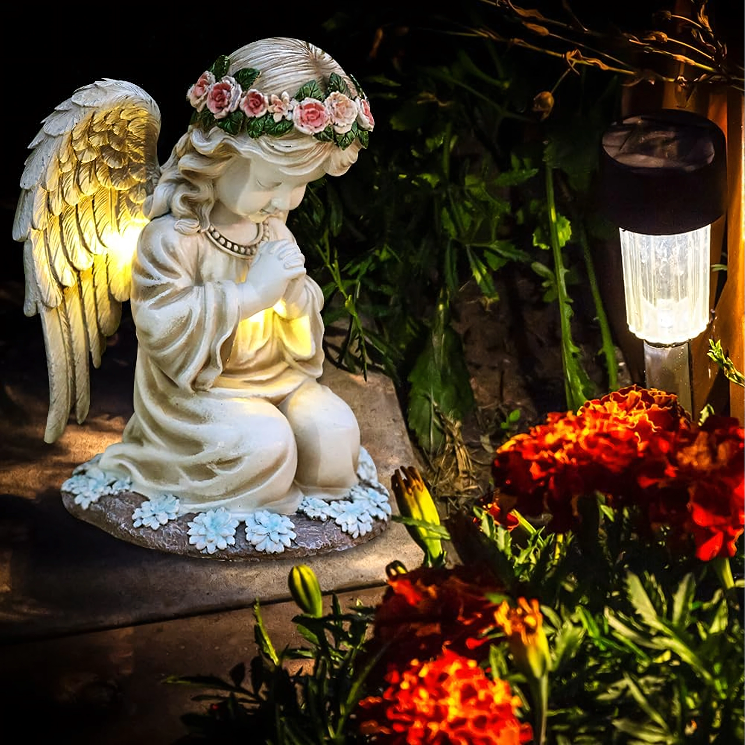 Une lumière douce et chaude illumine les ailes et la robe de l’ange, conférant à votre jardin, terrasse ou lieu de mémoire une atmosphère apaisante en soirée.