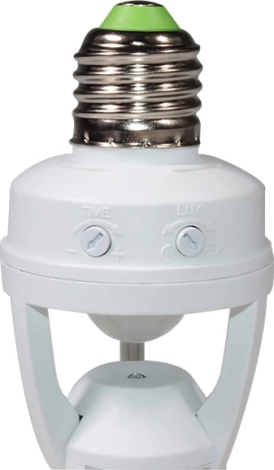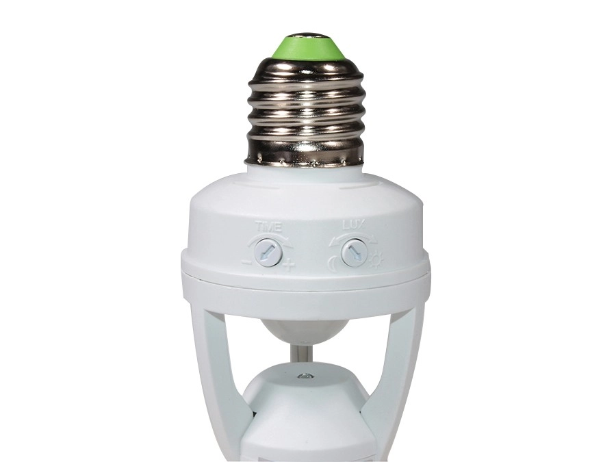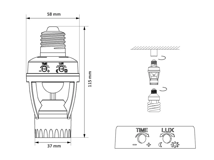 L’installation prend quelques minutes : il suffit de la visser dans la douille E27 existante et d’insérer l’ampoule. À l’aide des régulateurs rotatifs, vous réglez facilement le temps d’éclairage (TIME) et le seuil de luminosité (LUX). Le capteur utilise une détection infrarouge (PIR) et distingue de manière fiable le jour et la nuit, ce qui permet d’économiser de l’énergie et de réduire vos coûts.