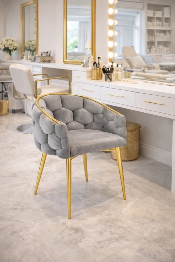 La chaise FERTONE BALLOON allie velours luxueux, forme type fauteuil confortable et pieds métalliques dorés pour un siège stylé adapté à la salle à manger, au salon ou à la coiffeuse. Son rembourrage moelleux, le dossier enveloppant et la teinte grise universelle assurent confort et harmonie avec un intérieur moderne. Charge maximale jusqu’à 100 kg et entretien facile pour un usage quotidien.