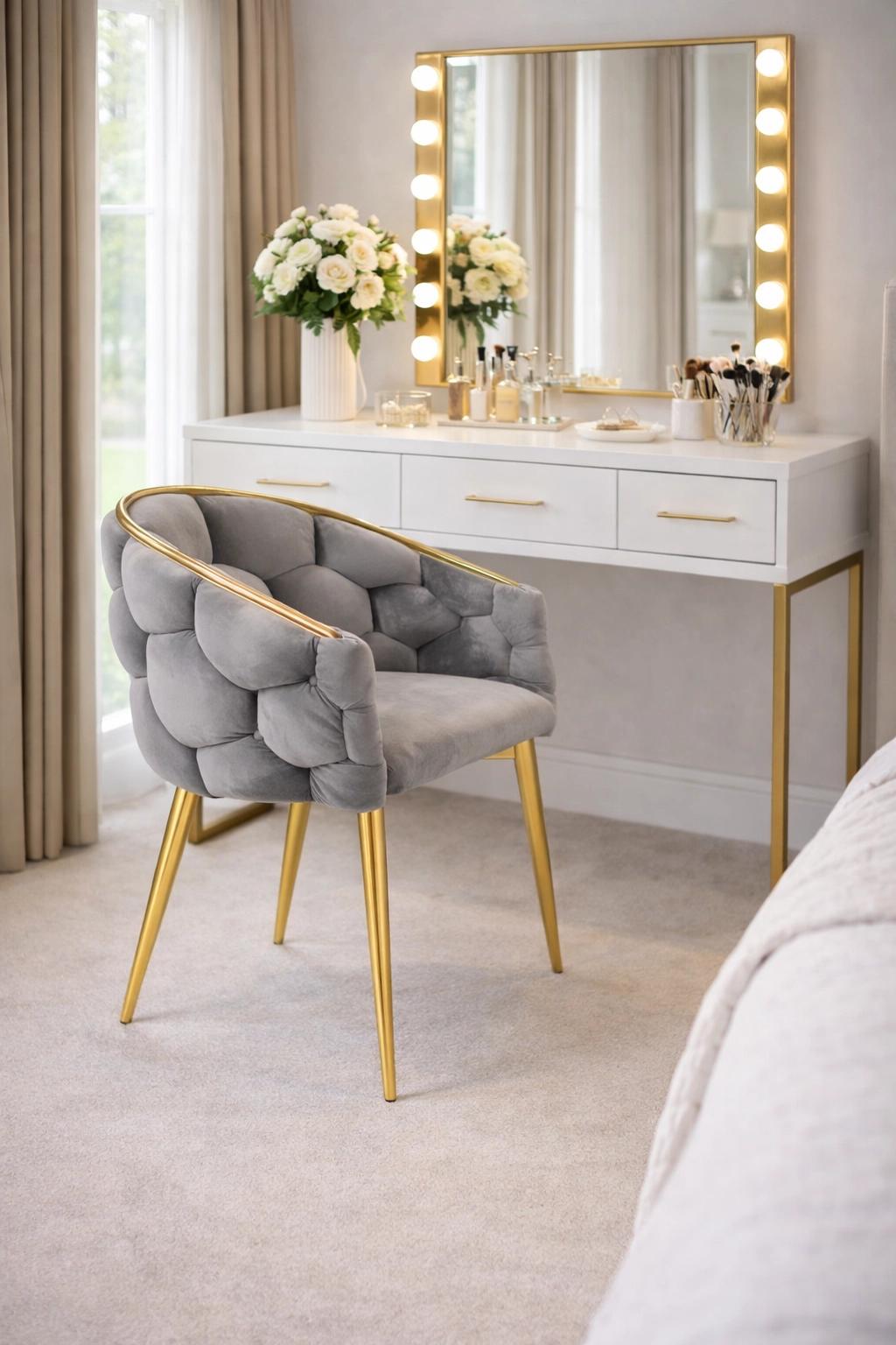 Des pieds métalliques élancés et un liseré doré apportent une touche de luxe à l’intérieur et s’accordent parfaitement avec le velours gris.