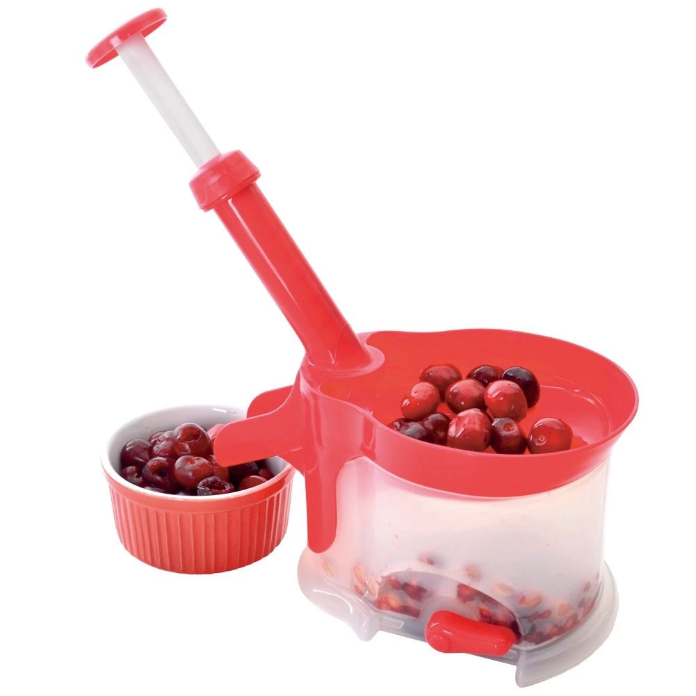 Le piston manuel expulse de manière fiable le noyau dans le réservoir inférieur, tandis que le fruit dénoyauté s’écoule par le bec. Idéal pour desserts, confitures et salades.