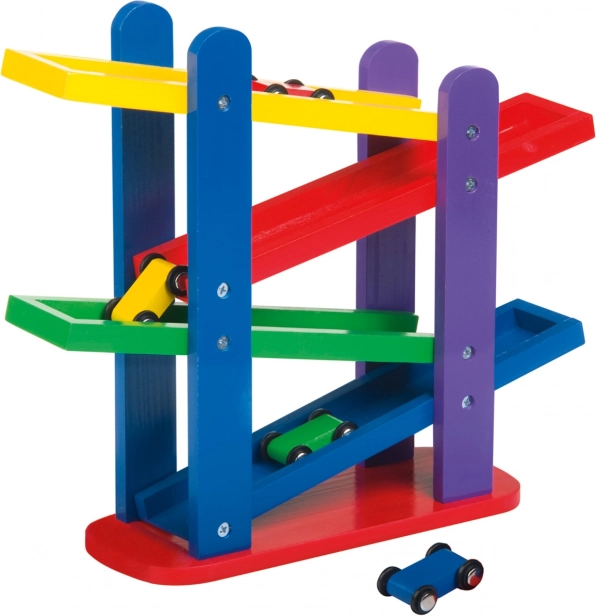 Un circuit de voitures en bois avec trois petites voitures colorées offre un divertissement sans fin grâce au retournement facile sur des pistes en cascades colorées.