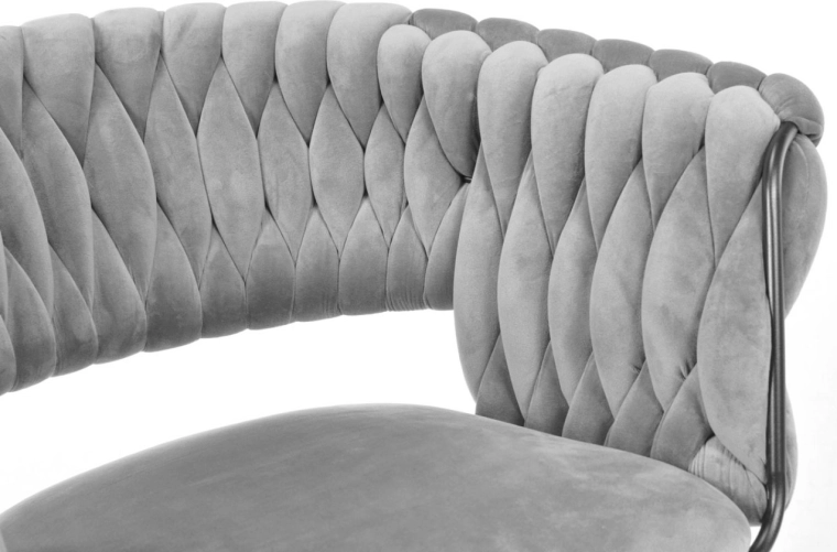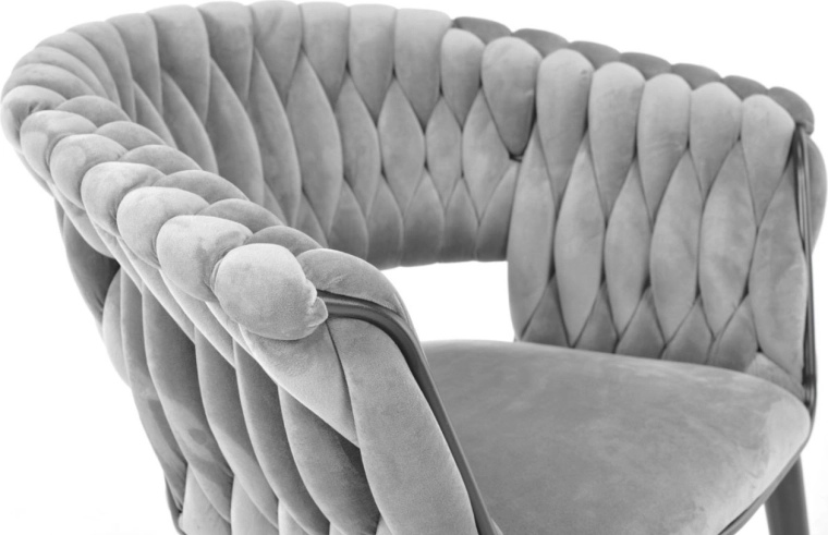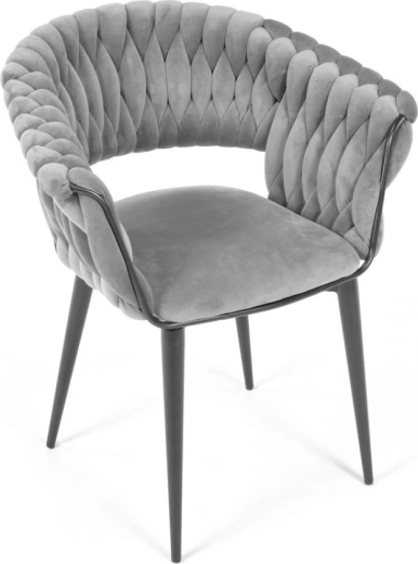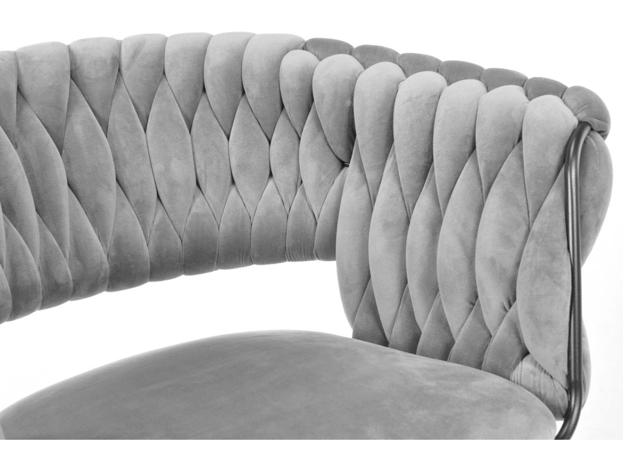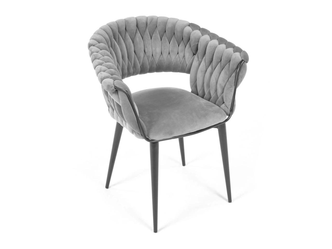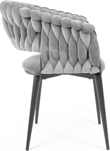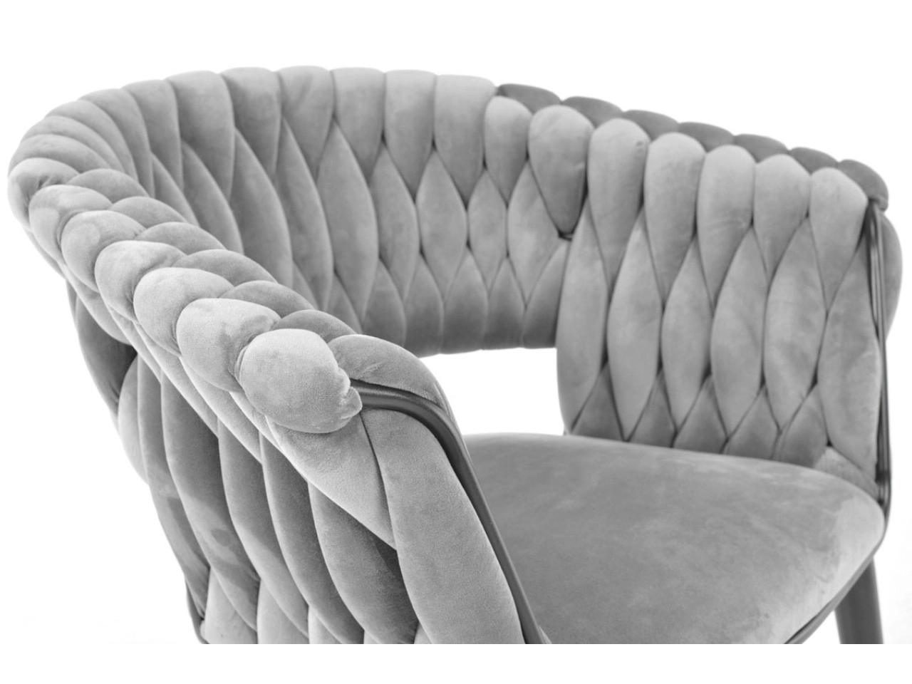 Élégant fauteuil gris en doux velours avec un dossier tressé distinctif et des pieds métalliques noirs qui apportent une touche glamour moderne à l’intérieur. Il offre un rembourrage confortable, une structure stable et un contraste stylé entre le gris et le noir, idéal pour la salle à manger, le salon ou le bureau.