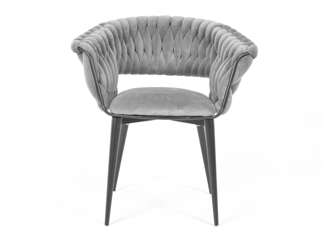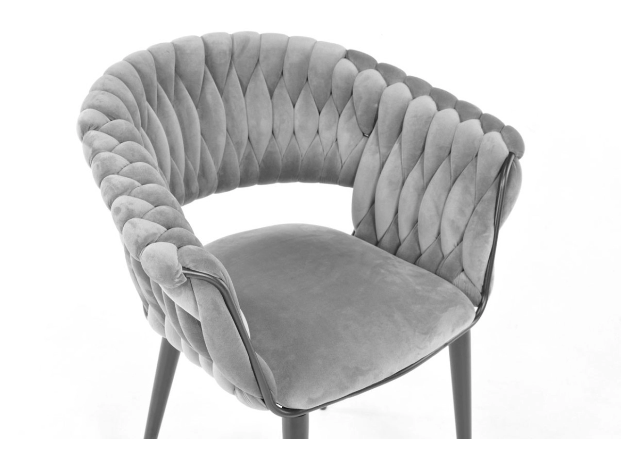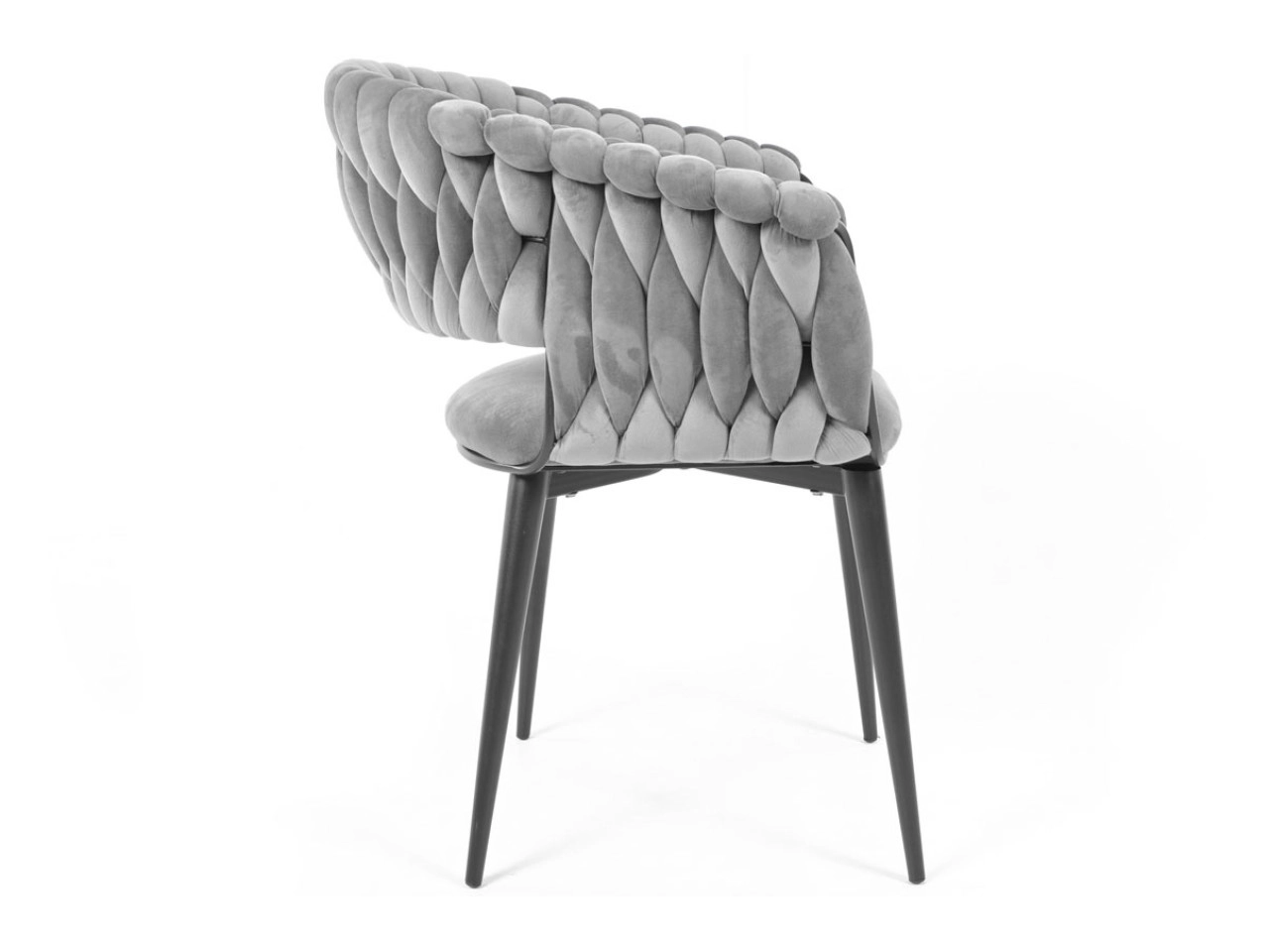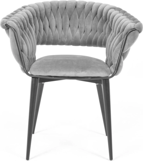 Élégant fauteuil gris en doux velours avec un dossier tressé distinctif et des pieds métalliques noirs qui apportent une touche glamour moderne à l’intérieur. Il offre un rembourrage confortable, une structure stable et un contraste stylé entre le gris et le noir, idéal pour la salle à manger, le salon ou le bureau.