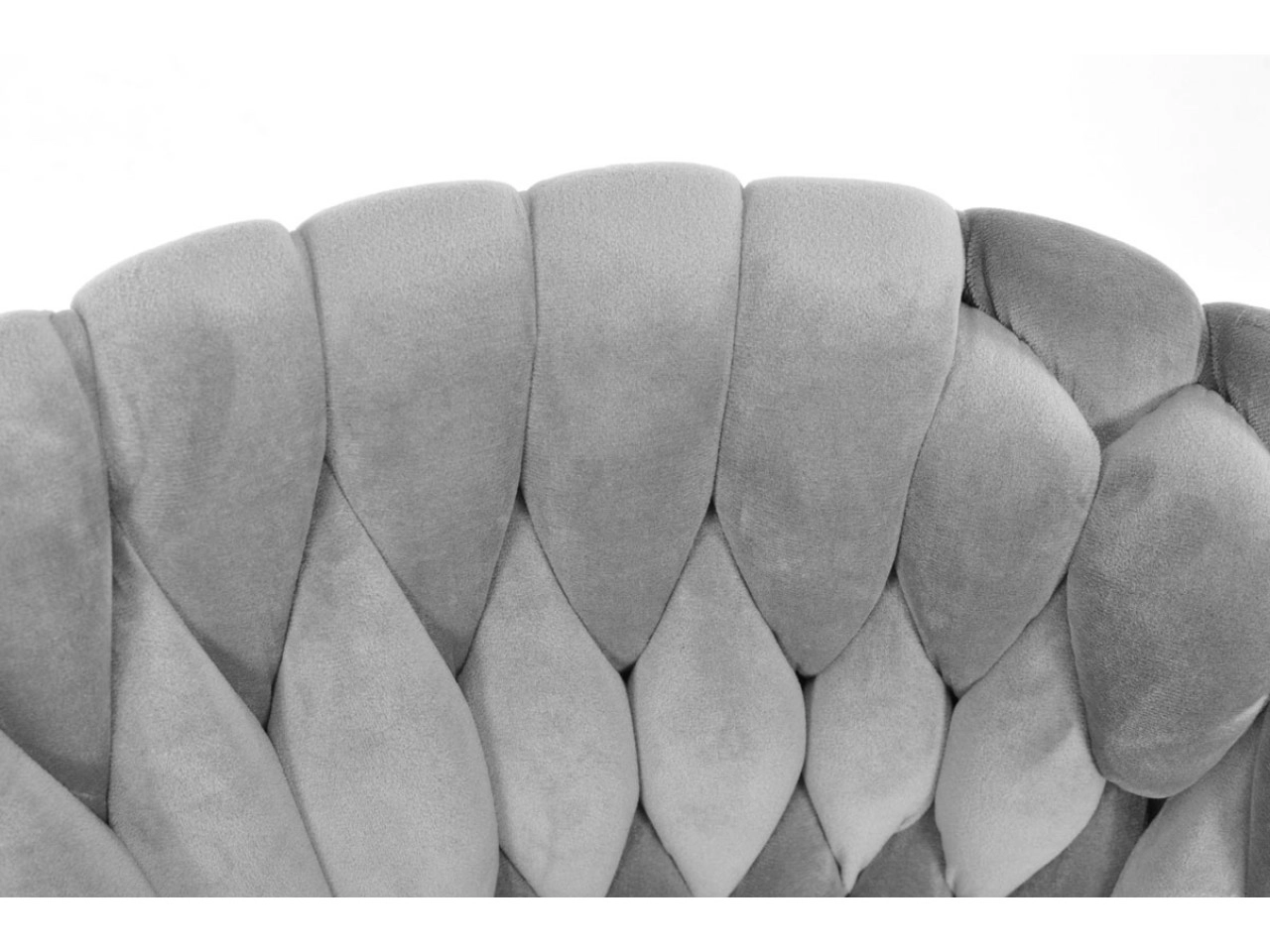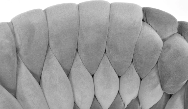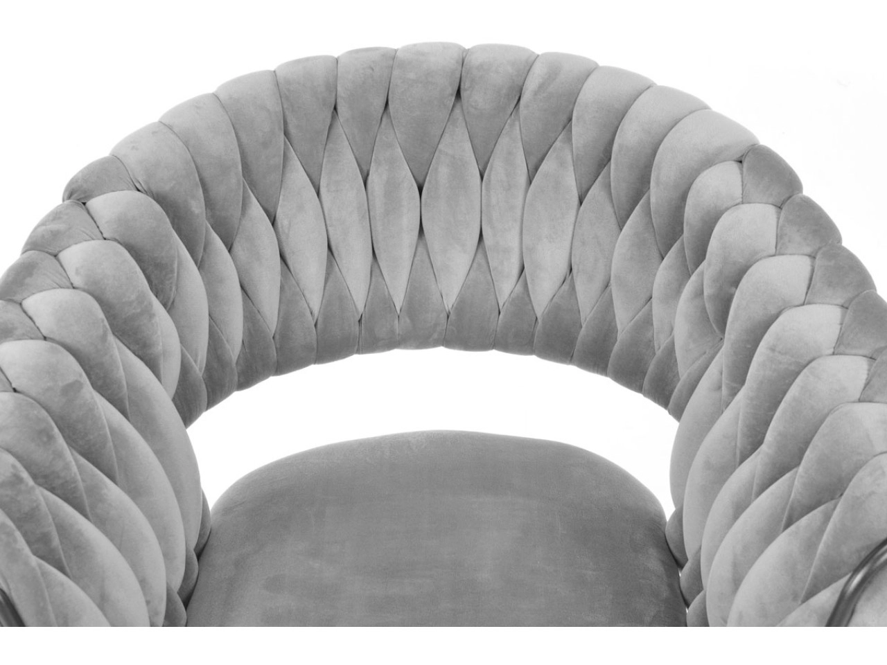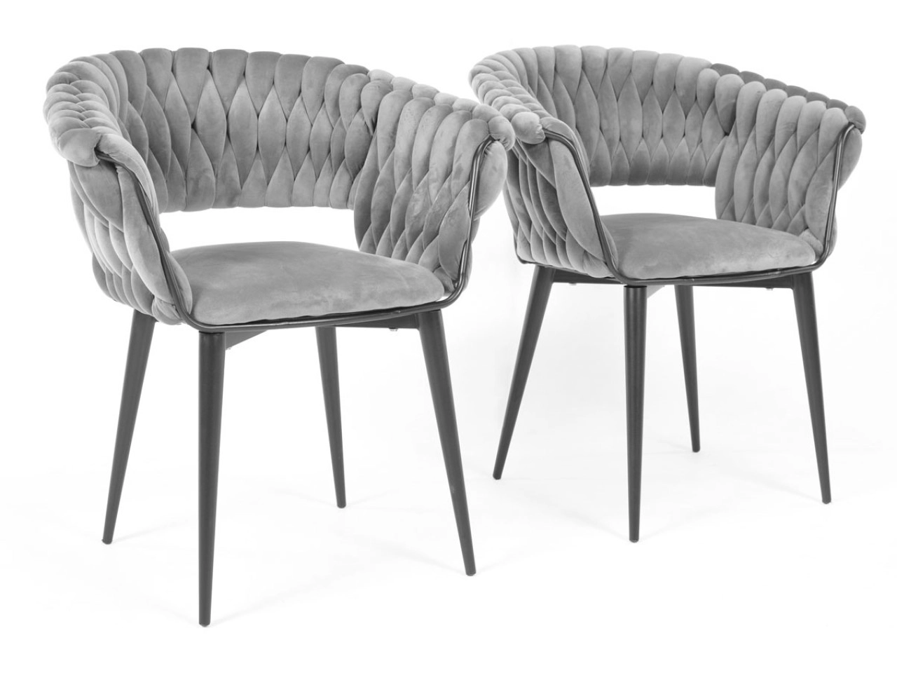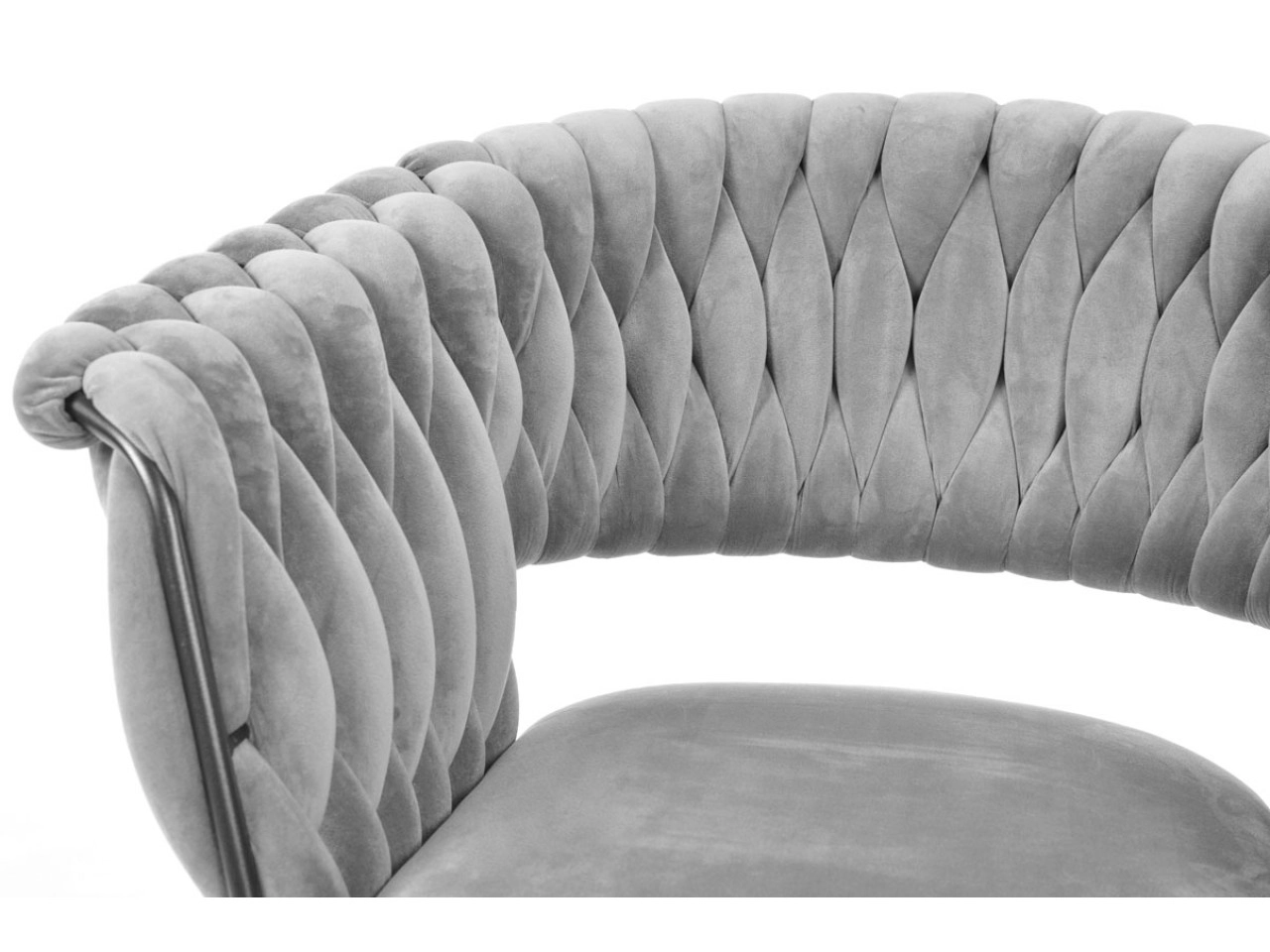Élégant fauteuil gris en doux velours avec un dossier tressé distinctif et des pieds métalliques noirs qui apportent une touche glamour moderne à l’intérieur. Il offre un rembourrage confortable, une structure stable et un contraste stylé entre le gris et le noir, idéal pour la salle à manger, le salon ou le bureau.