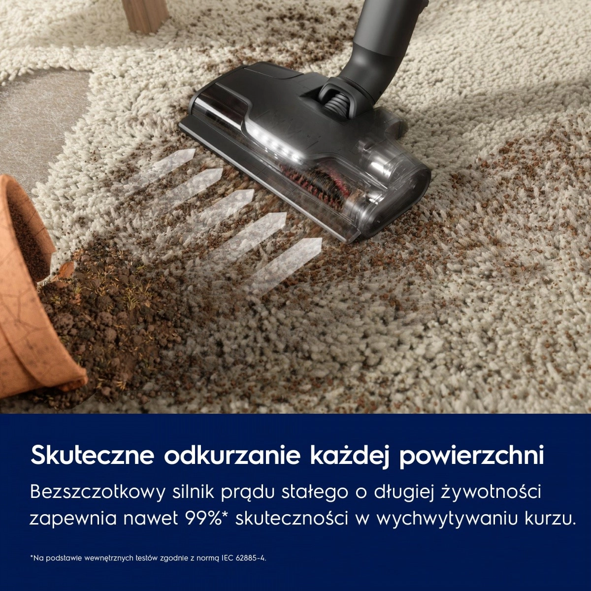 La tête PowerPro Multi-surface assure un nettoyage efficace sur sols durs et tapis et peut capturer jusqu’à 99 % de la poussière en un seul double passage (selon tests internes IEC 62885-2). Le moteur DC sans balais, durable, et les lamelles en caoutchouc uniques augmentent l’efficacité de collecte des saletés.