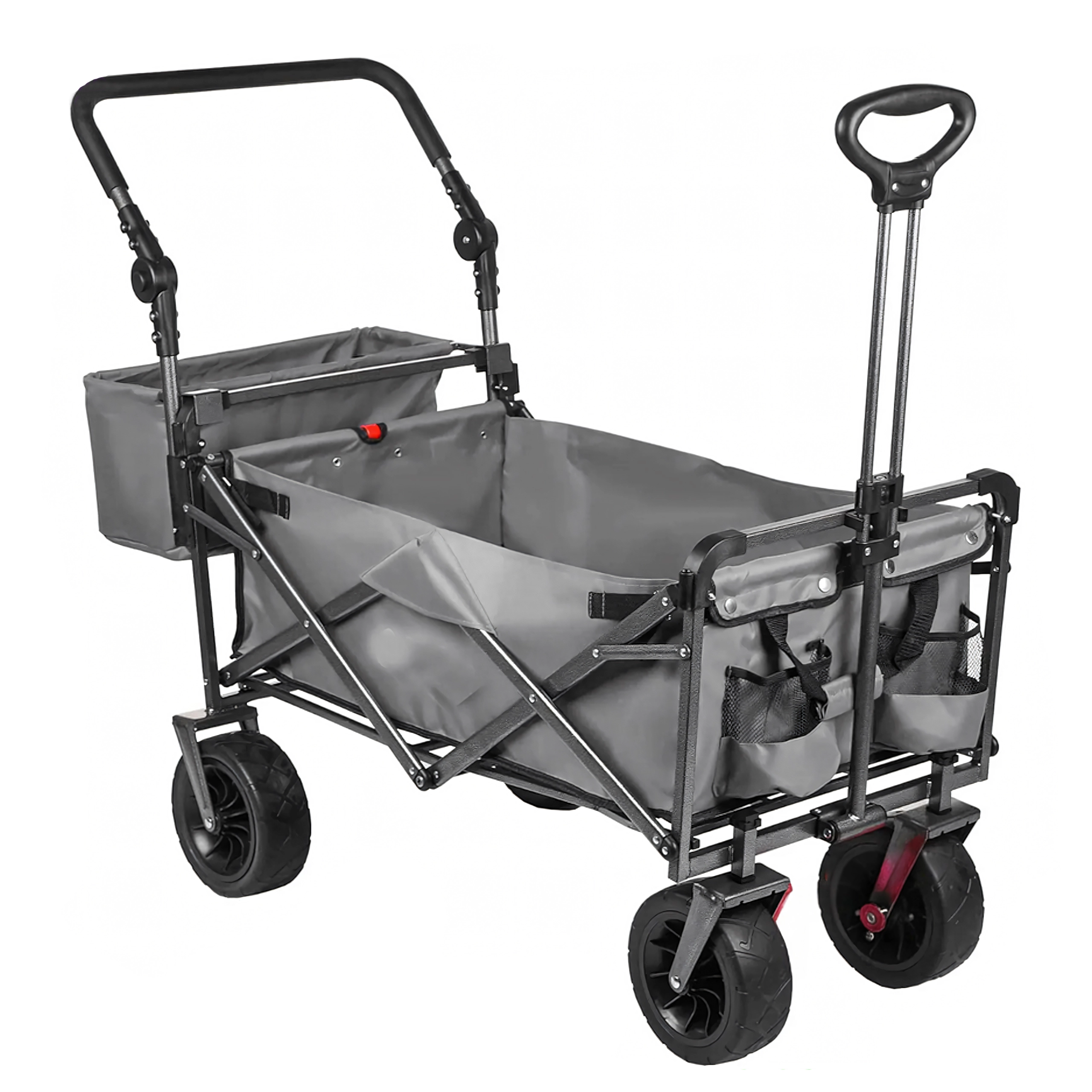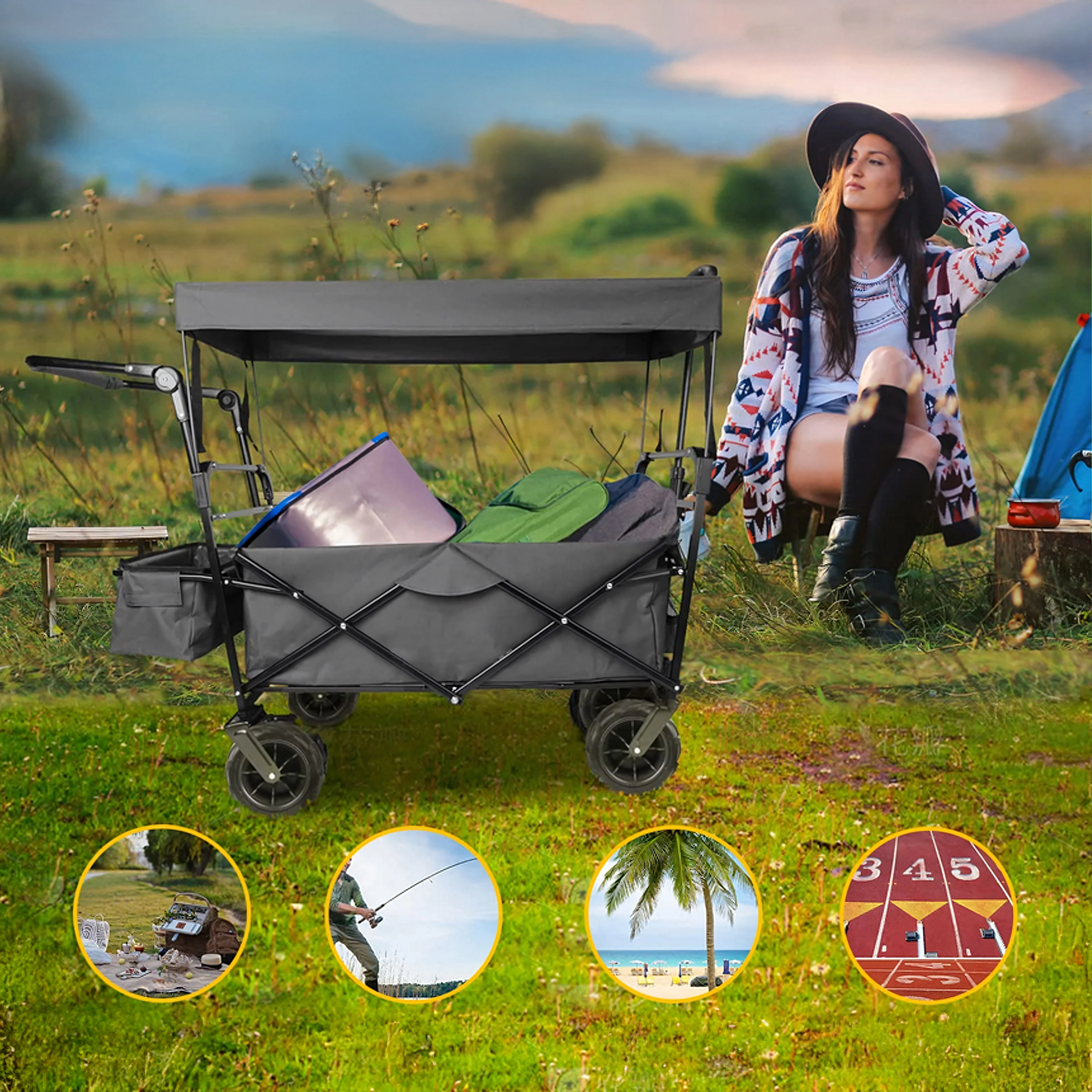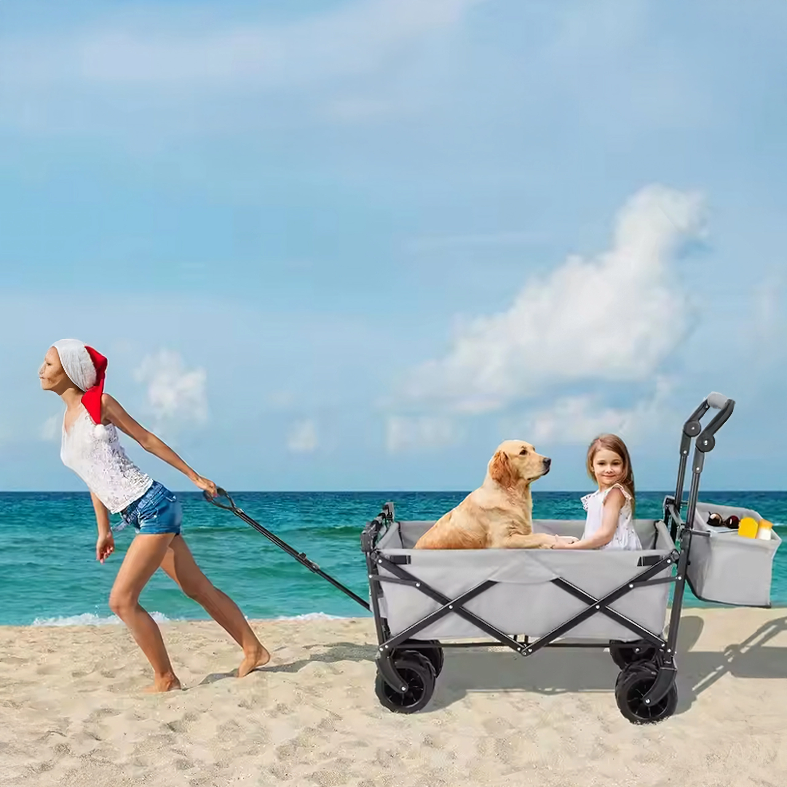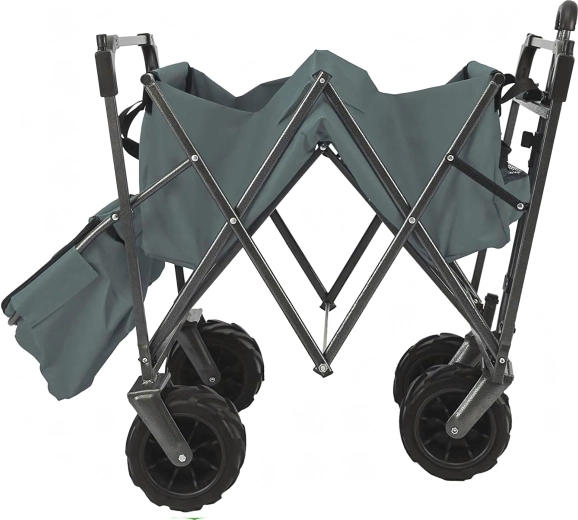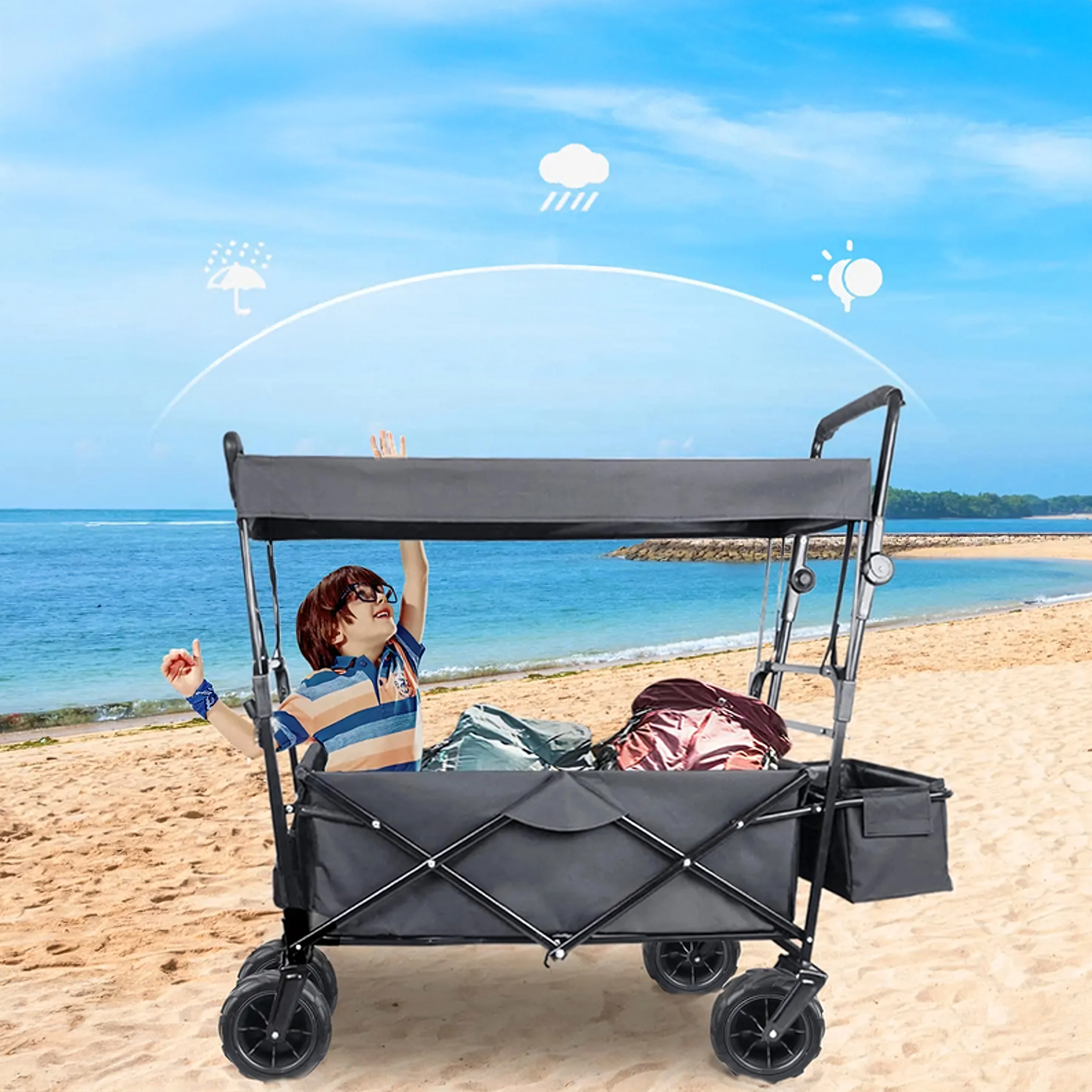 De grandes roues polyvalentes assurent un déplacement fluide sur le sable, l’herbe et les chemins gravillonnés. Idéal pour la plage, le jardin et le camping.