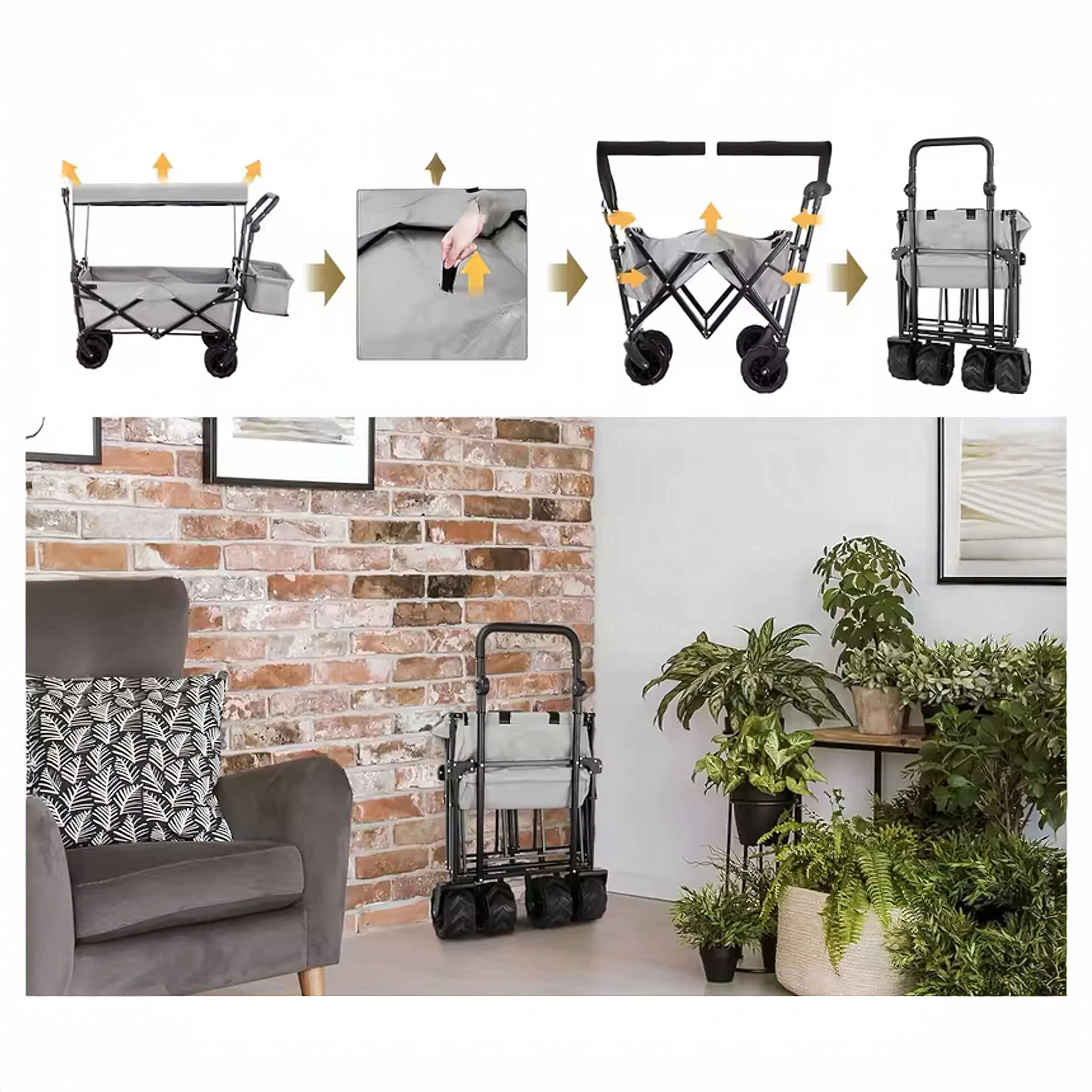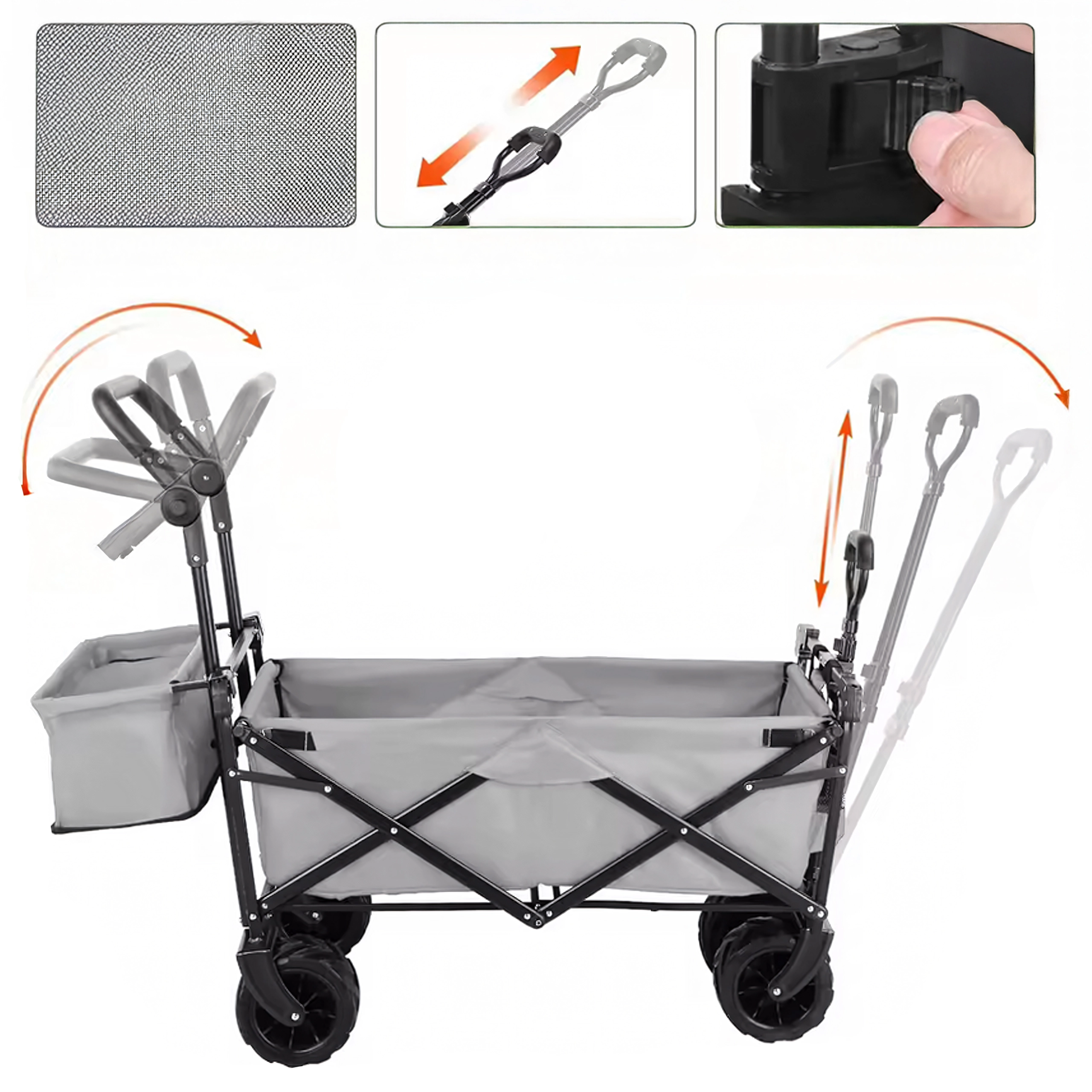 Pratique chariot pliant pour le jardin, la plage et la pêche, doté d’un cadre en acier robuste, d’une benne spacieuse et de grandes roues XL tout-terrain. Il offre une capote pare-soleil pour protéger la charge ou les enfants, une poignée télescopique pour un tirage aisé et un pliage rapide en format compact pour un rangement économe en place.