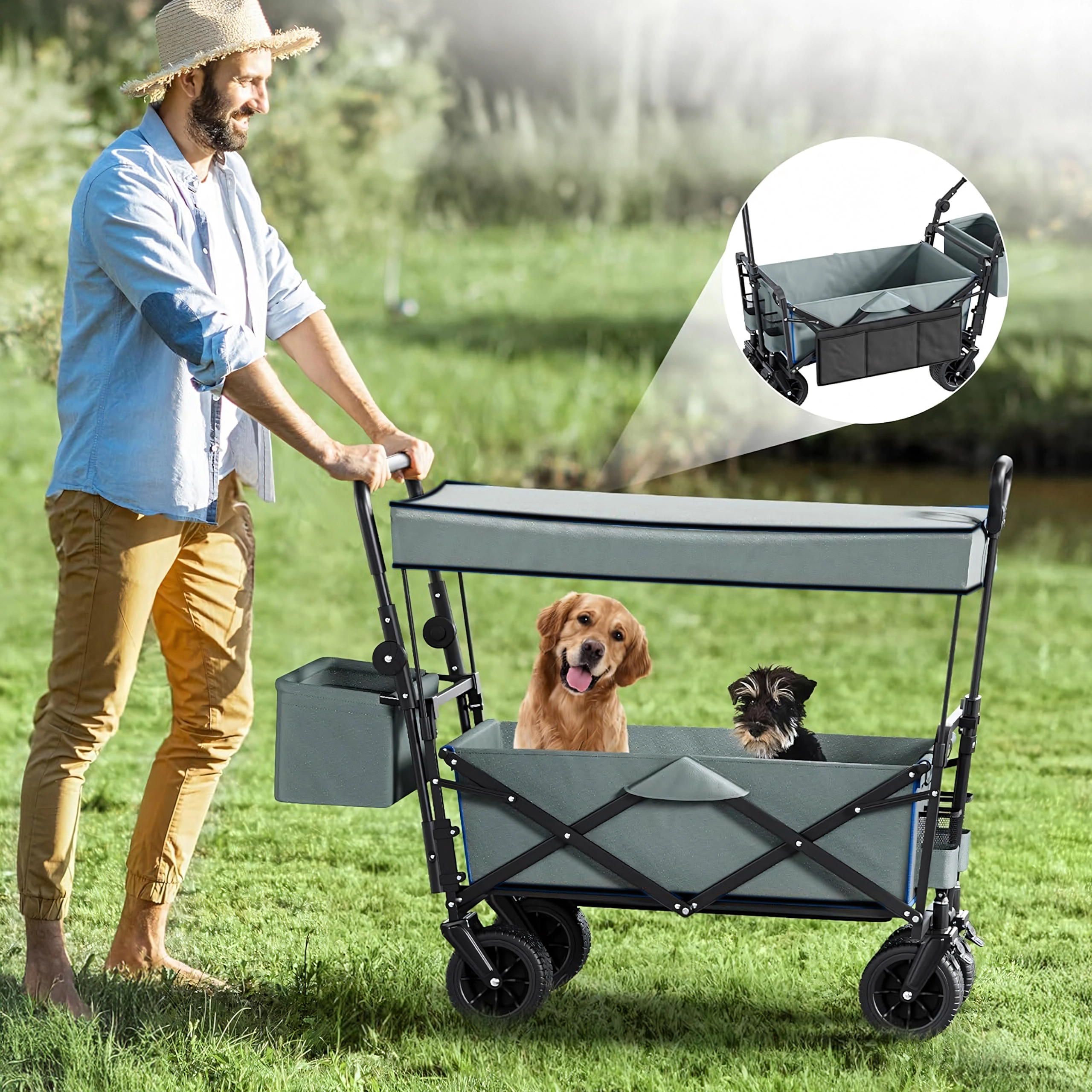 Le dôme amovible protège le contenu du soleil et des brises légères – pratique pour transporter des enfants, des animaux de compagnie ou du matériel de camping.