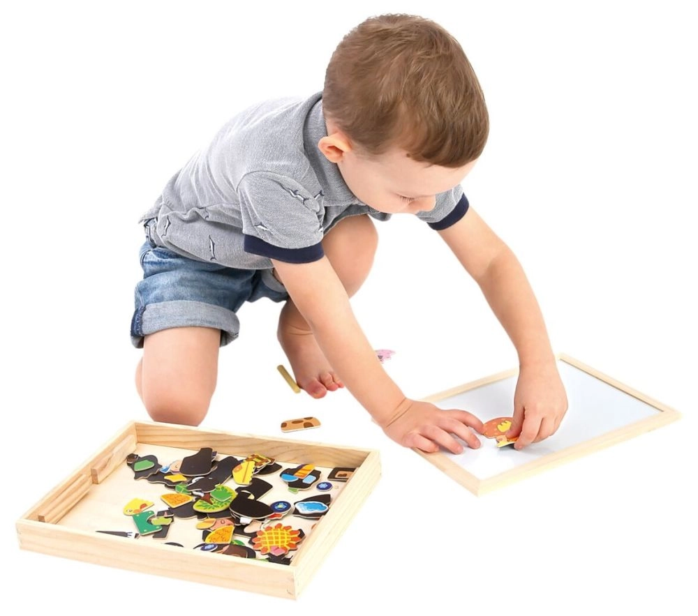 Avec cet ensemble, vous aurez tout ce dont vous avez besoin pour des heures d'amusement. Le pack comprend un marqueur avec feutre, des craies avec une petite éponge et un grand nombre de pièces de puzzle magnétiques. De plus, vous obtiendrez de l'inspiration avec un dépliant qui vous aidera à créer des images intéressantes et créatives.