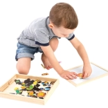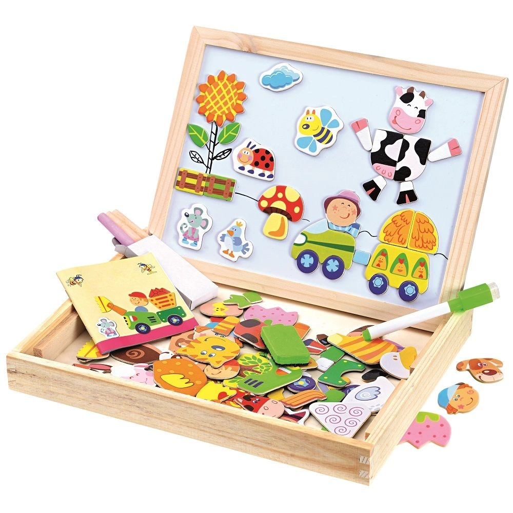Tous ces outils créatifs et pièces sont rangés dans une boîte en bois qui est facilement transportable. Les enfants s'amuseront pendant des heures avec ce tableau sur le thème de la ferme, tout en développant leur imagination et leurs compétences.