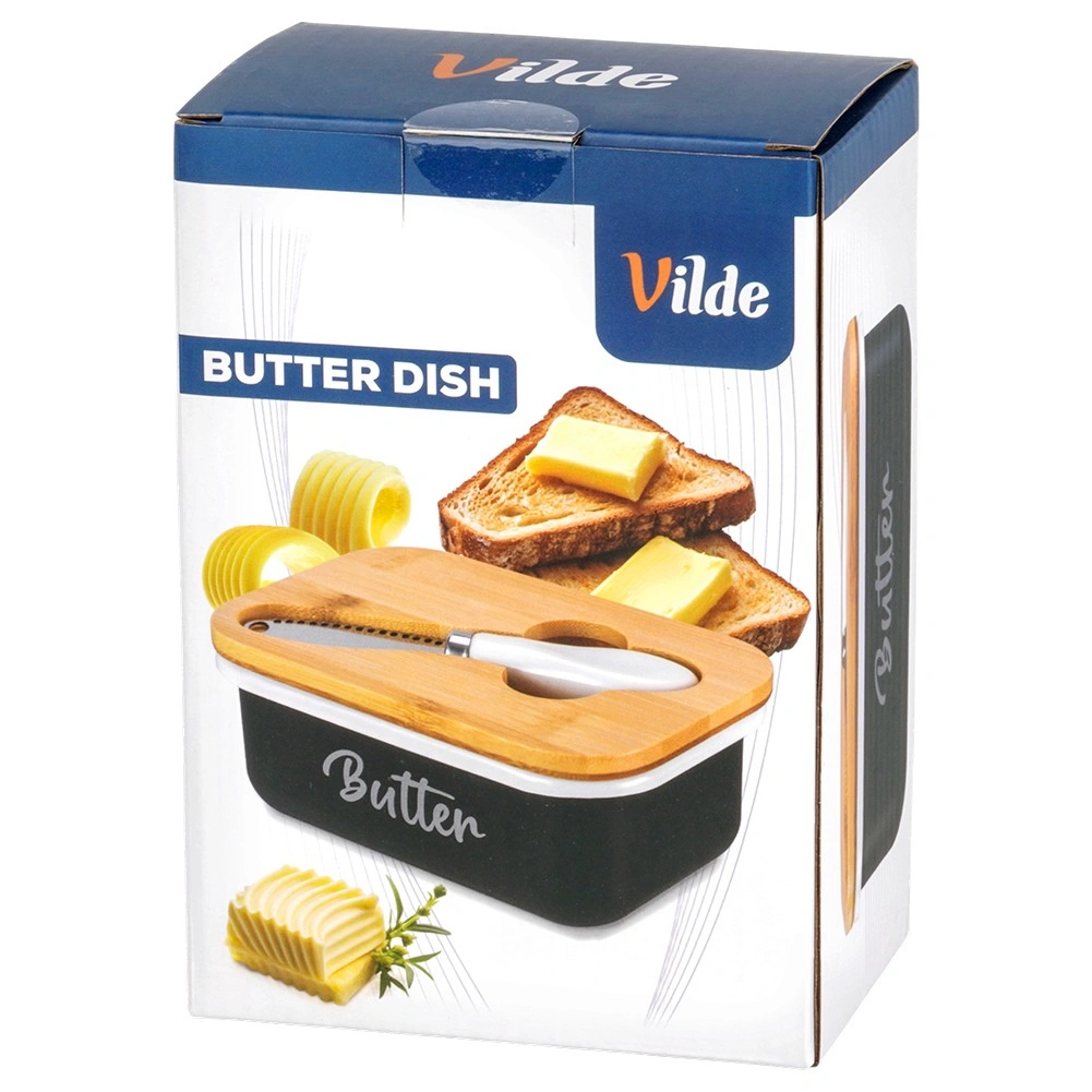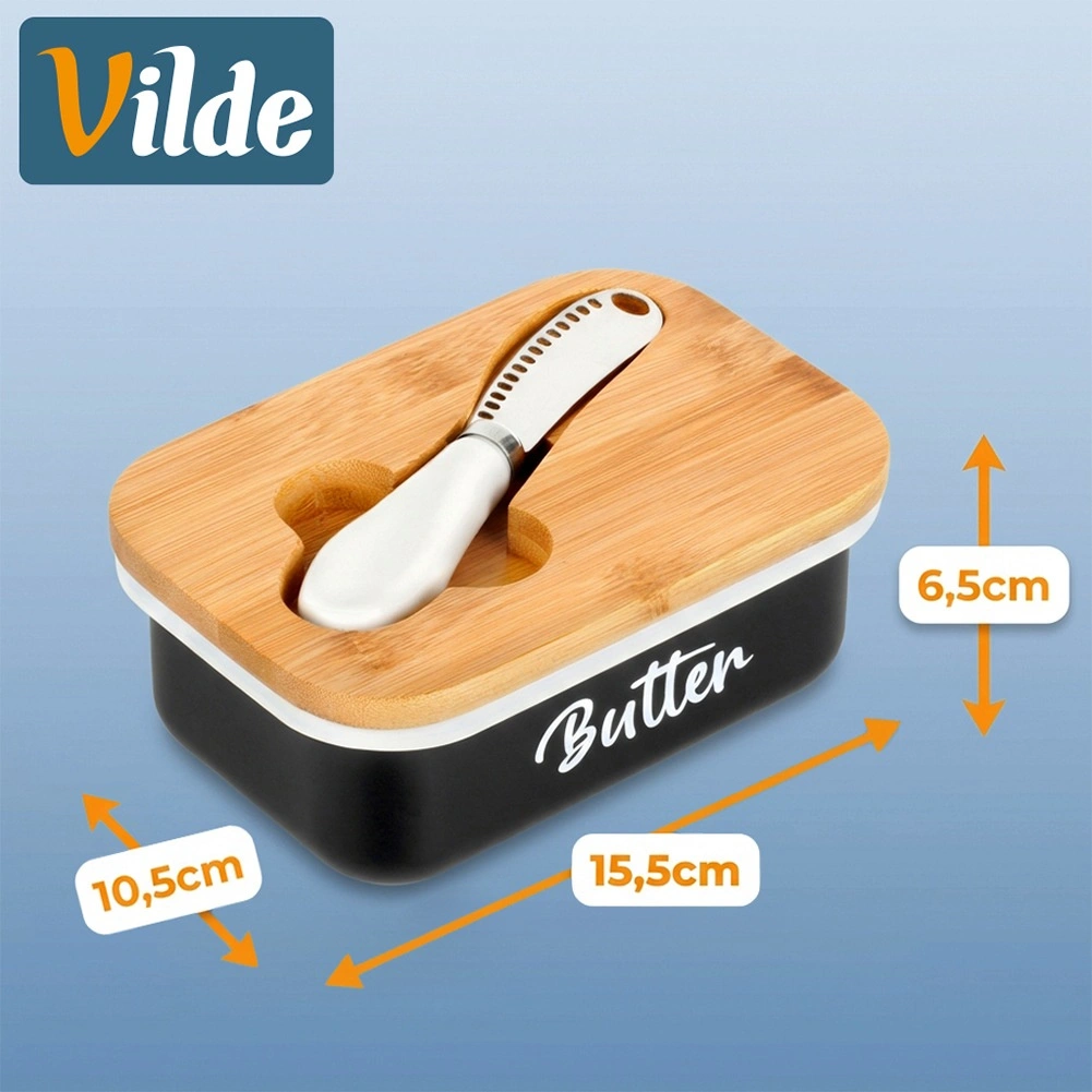 Le beurrier Vilde allie look moderne et praticité maximale. Le corps métallique noir avec l’inscription blanche Butter est complété par un couvercle en bambou naturel, qui aide à conserver le beurre frais plus longtemps et protégé. Une encoche intégrée dans le couvercle abrite le couteau fourni, pour tout avoir facilement à portée de main.