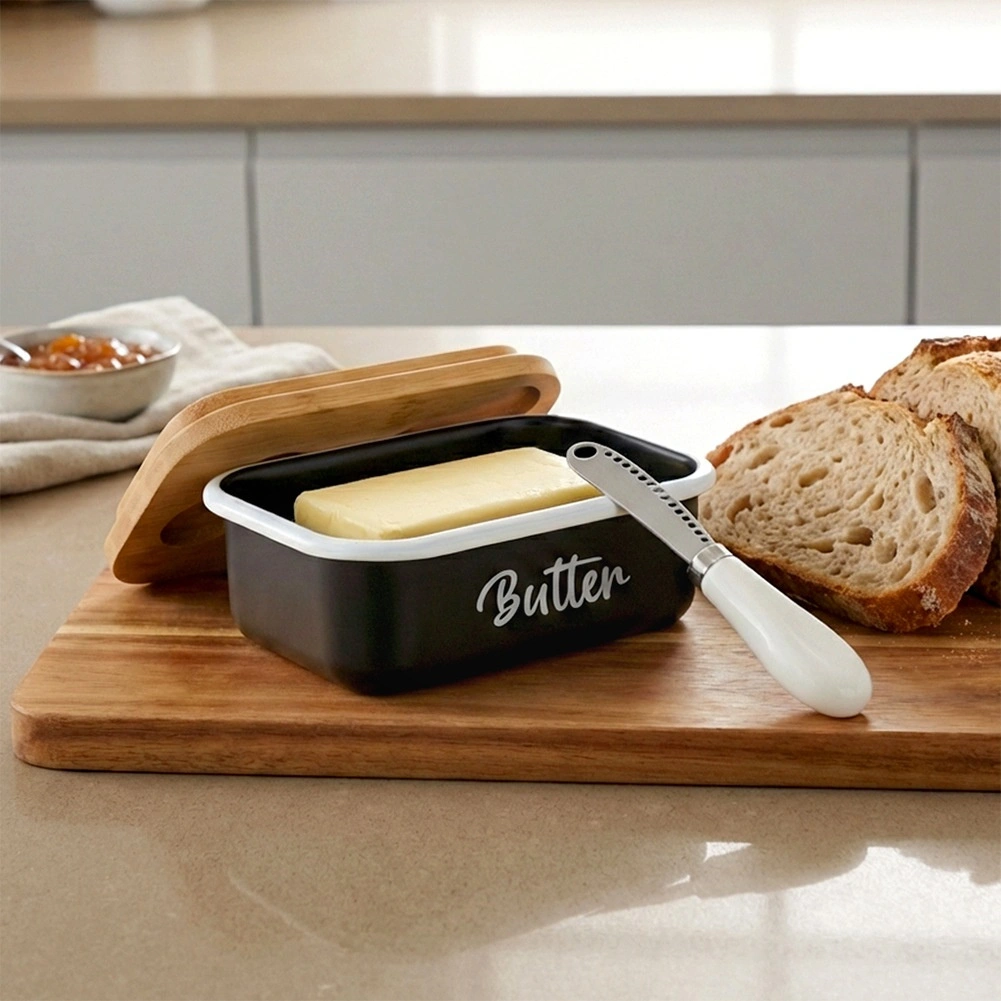 Un beurrier élégant pour un usage quotidien garde votre beurre longtemps frais et prêt à être servi. Il possède un corps en métal noir avec l’inscription Butter, un couvercle en bambou et un couteau en acier inoxydable pratique rangé directement dans le couvercle. Facile à nettoyer et, grâce à son design intemporel, il s’intègre à toute cuisine.