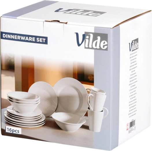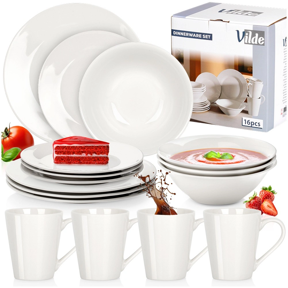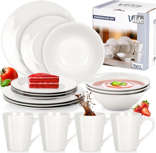 Élégant service de table en porcelaine pour 4 personnes offrant 16 pièces pour le quotidien comme pour les occasions spéciales. L’ensemble comprend des bols 600 ml, des assiettes plates, des assiettes à dessert et des mugs 300 ml. Le design blanc pur et intemporel s’intègre à toute cuisine, la vaisselle est compatible lave-vaisselle et micro-ondes.