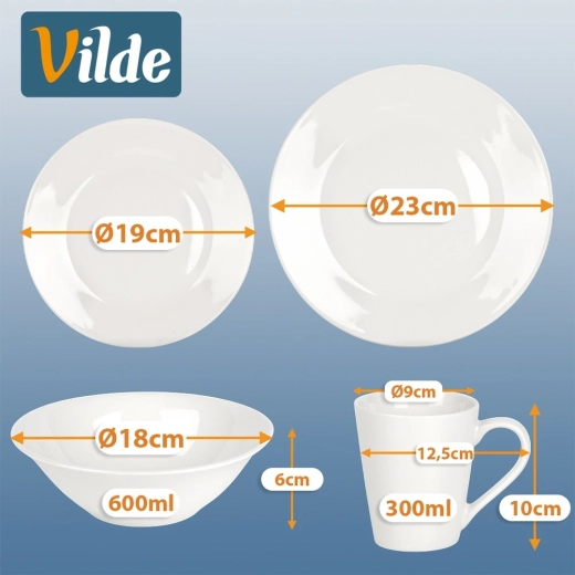 Contenu du set : 4 bols 18 × 6 cm (600 ml), 4 assiettes plates 23 × 23 × 2 cm, 4 assiettes à dessert 19 × 19 × 2 cm, 4 mugs 12,5 × 9 × 10 cm (300 ml). La vaisselle est idéale pour les soups, salades, plats principaux et desserts, les mugs conviennent pour le café et le thé. L’entretien facile au lave-vaisselle et le réchauffage sûr au micro-ondes font gagner du temps chaque jour.