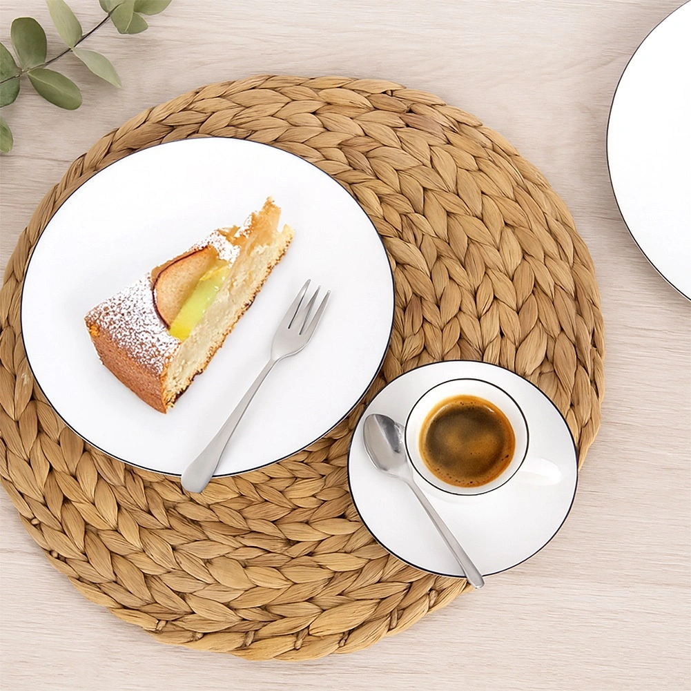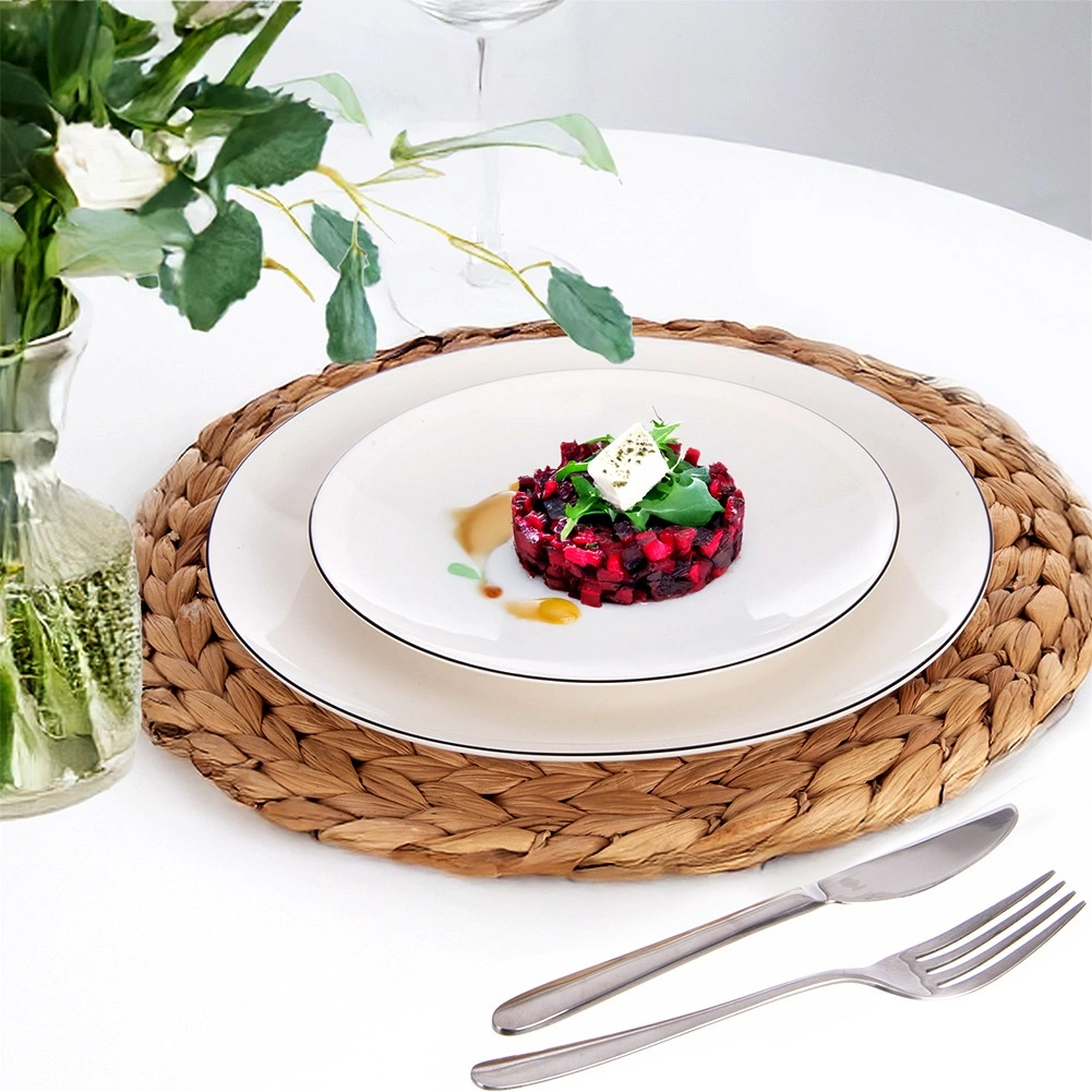 La porcelaine blanche rehaussée d’un fin bord noir apporte une touche élégante et moderne à votre table, facile à assortir avec le reste de votre vaisselle.