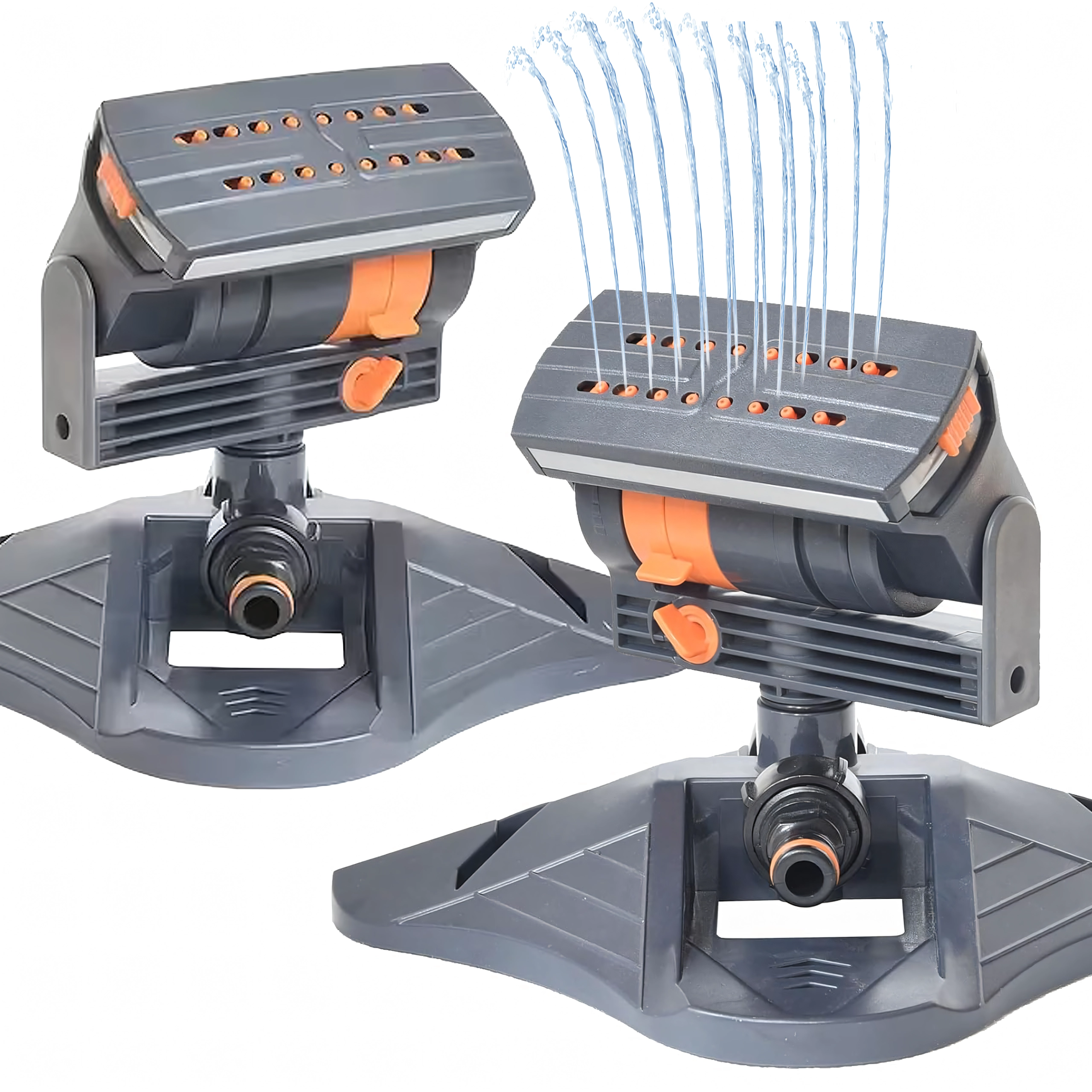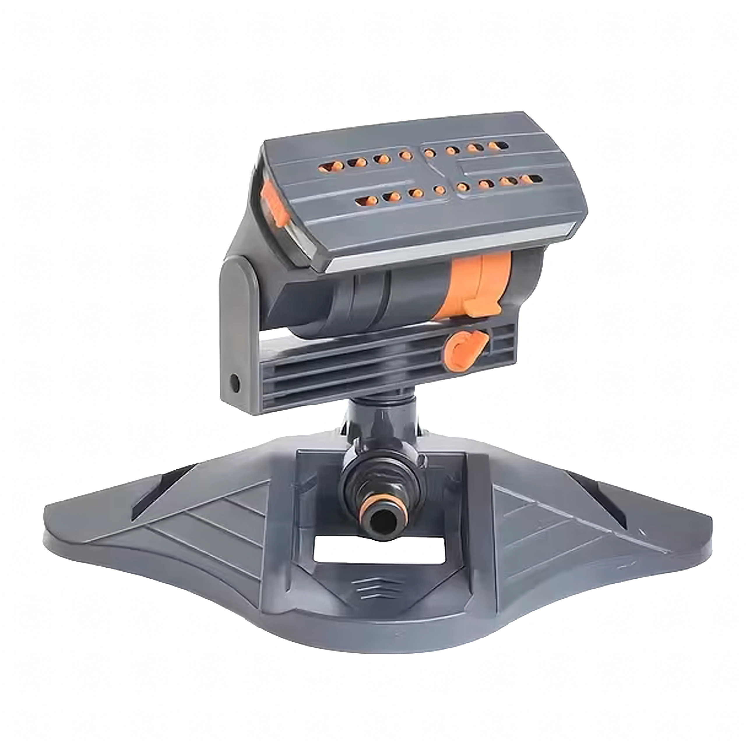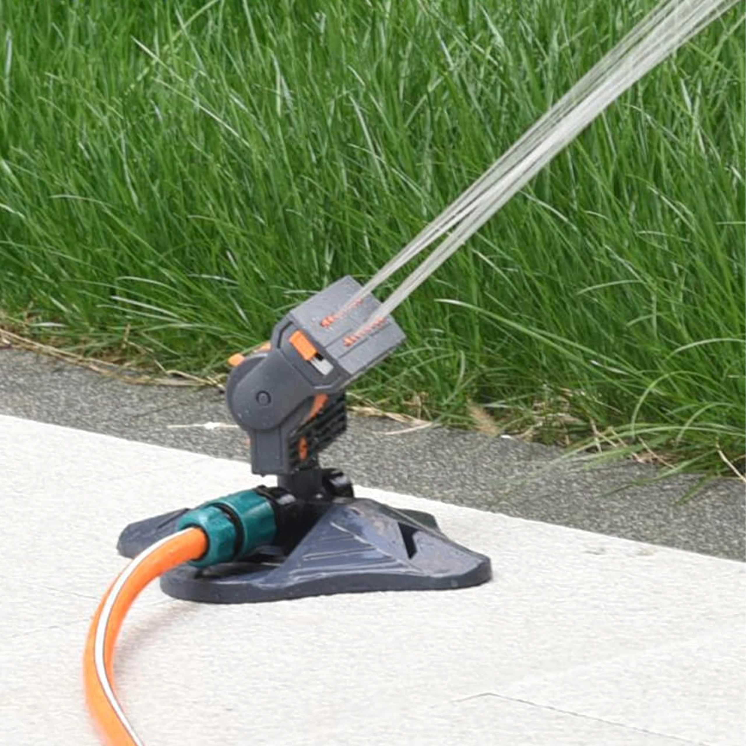 La large base maintient fermement l’arroseur en place. Le connecteur standard permet un raccord rapide au tuyau d’arrosage.