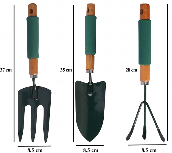 Ensemble pratique de trois outils manuels pour l’entretien des plates-bandes et des jardinières – pelle, cultivateur/mini râteau et fourche de jardin. Des têtes de travail en métal résistantes et des poignées ergonomiques antidérapantes assurent un travail confortable pour le bêchage, l’ameublissement du sol et le rempotage.