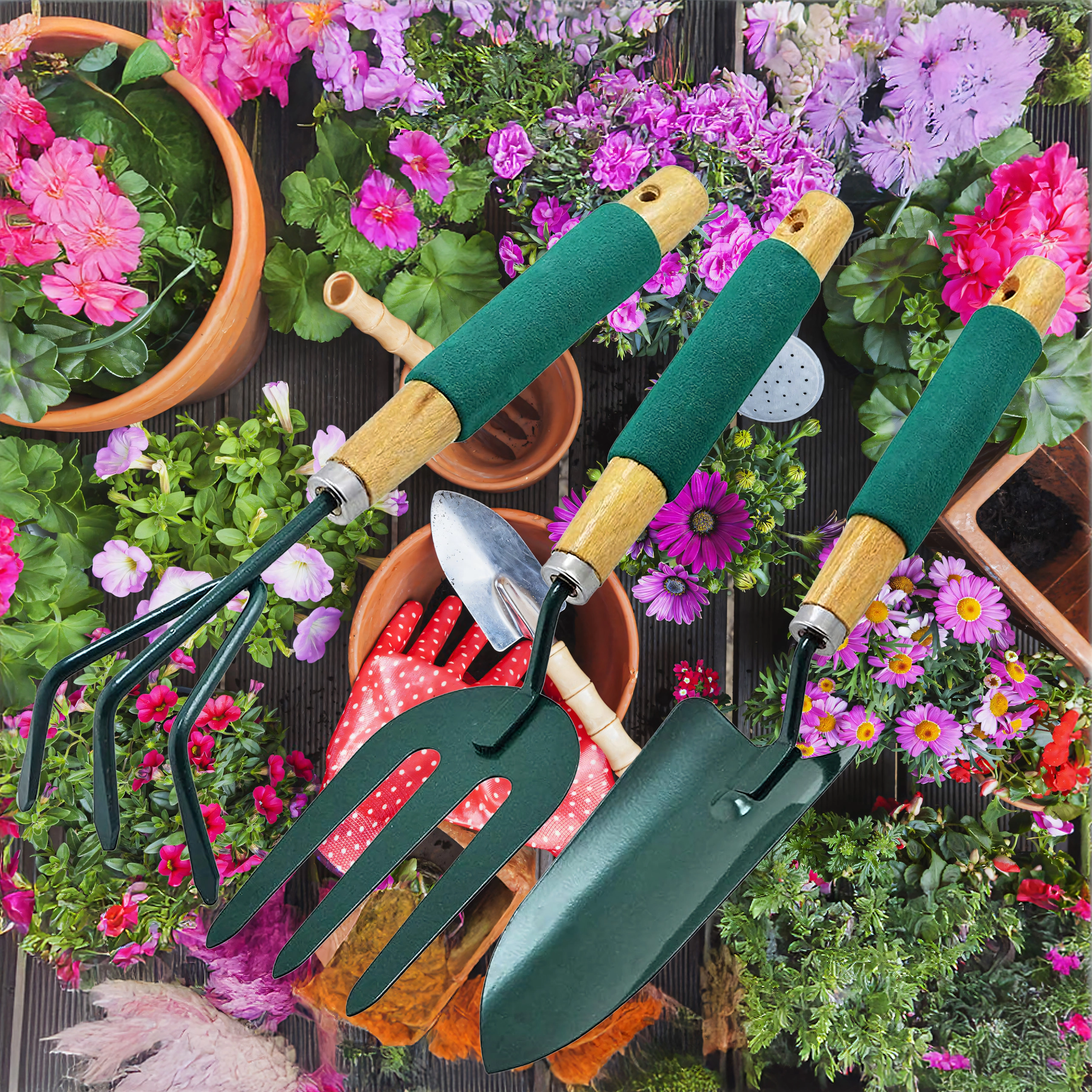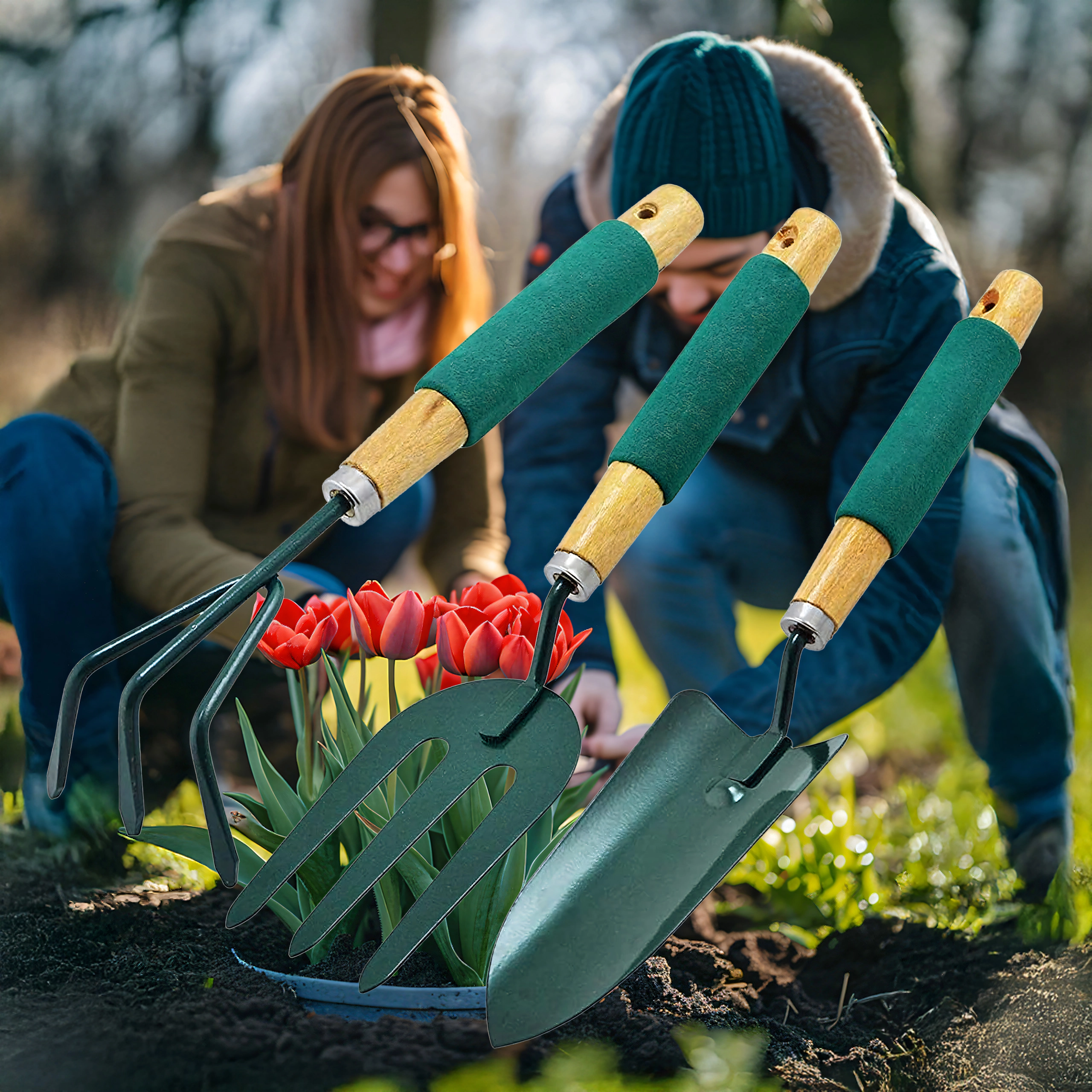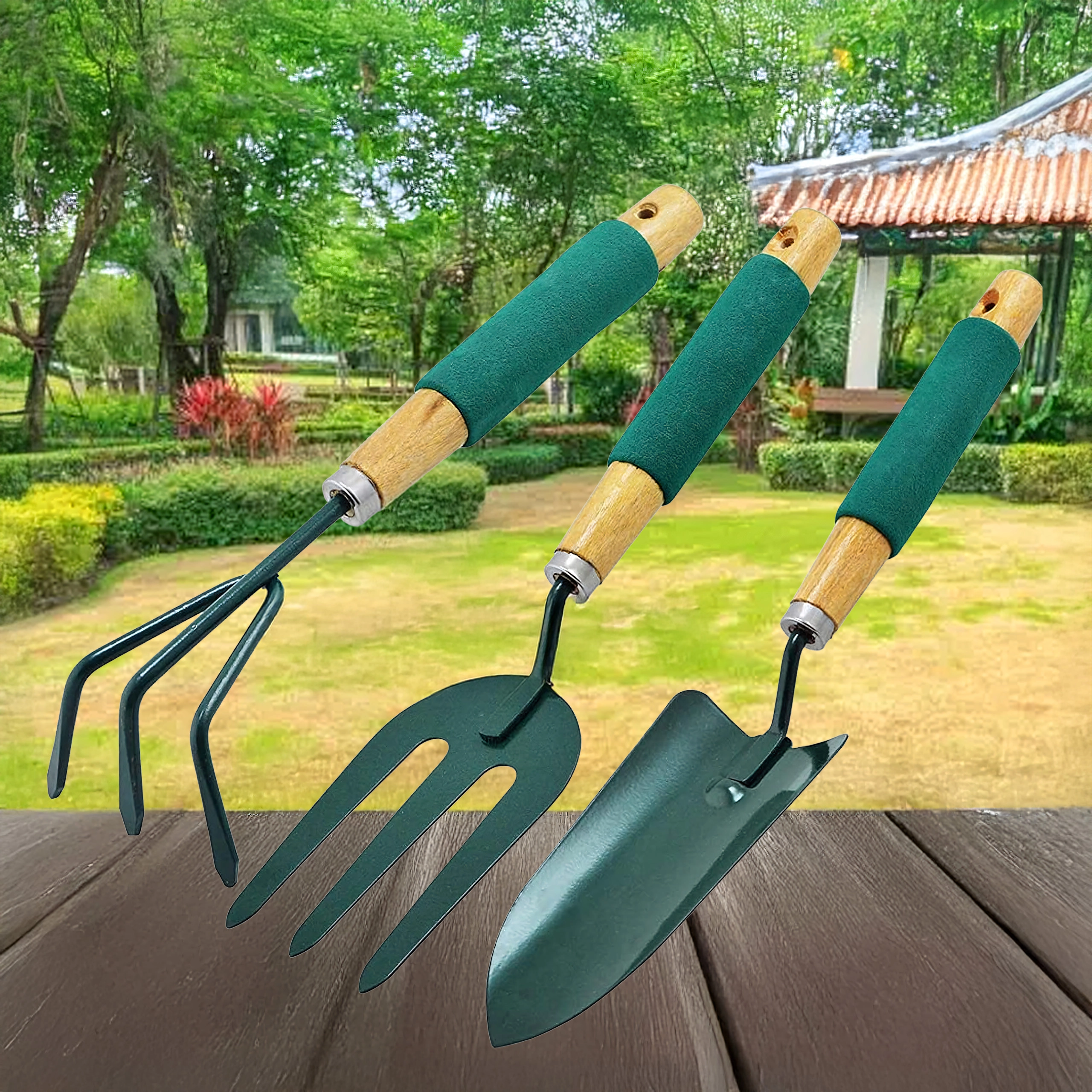 - 3 (pelle, cultivateur/mini râteau, fourche de jardin)