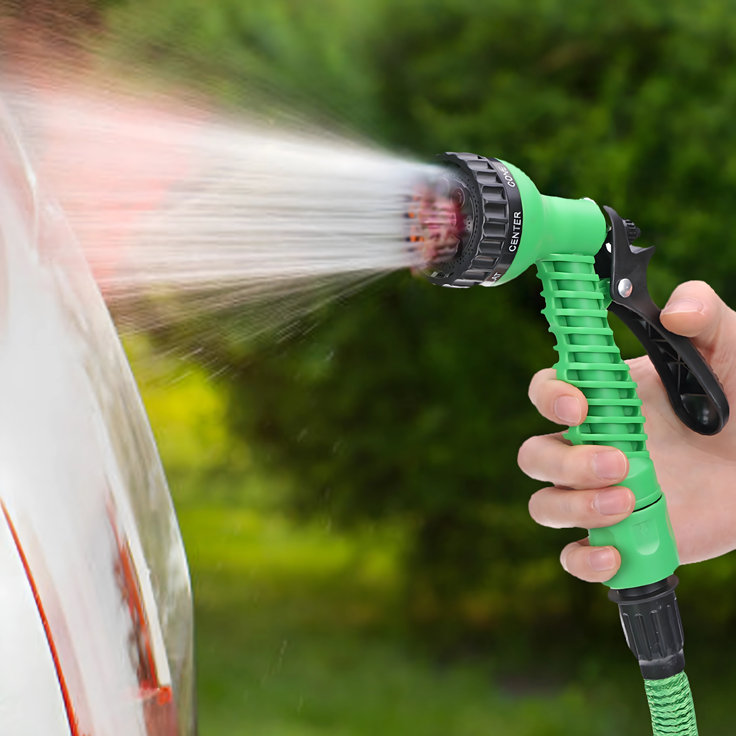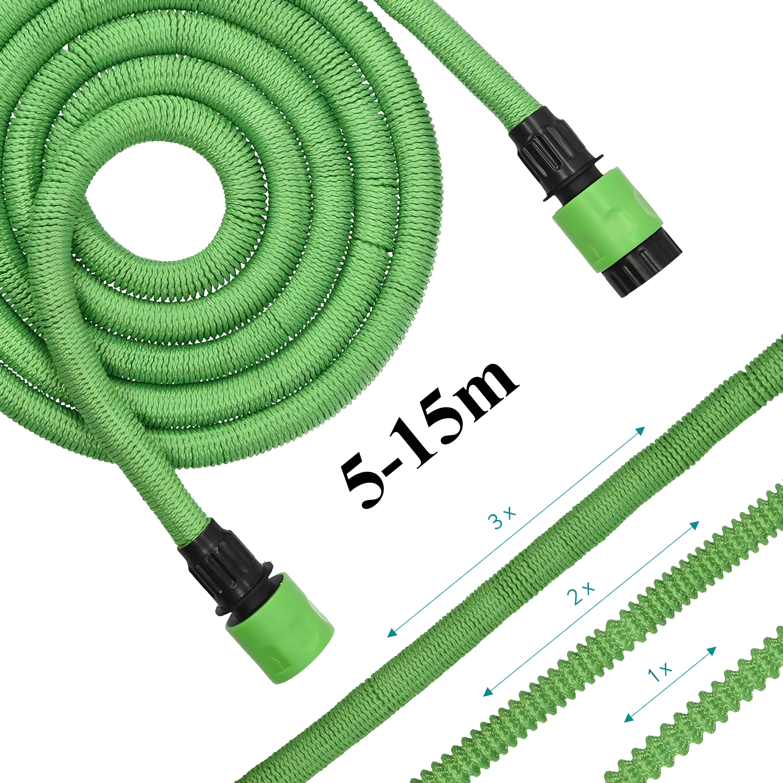 Le tuyau s’allonge jusqu’à 15 m sous l’effet de la pression de l’eau et revient à une longueur compacte de 5 m après vidange. Manipulation facile sans enchevêtrement ni pliures.