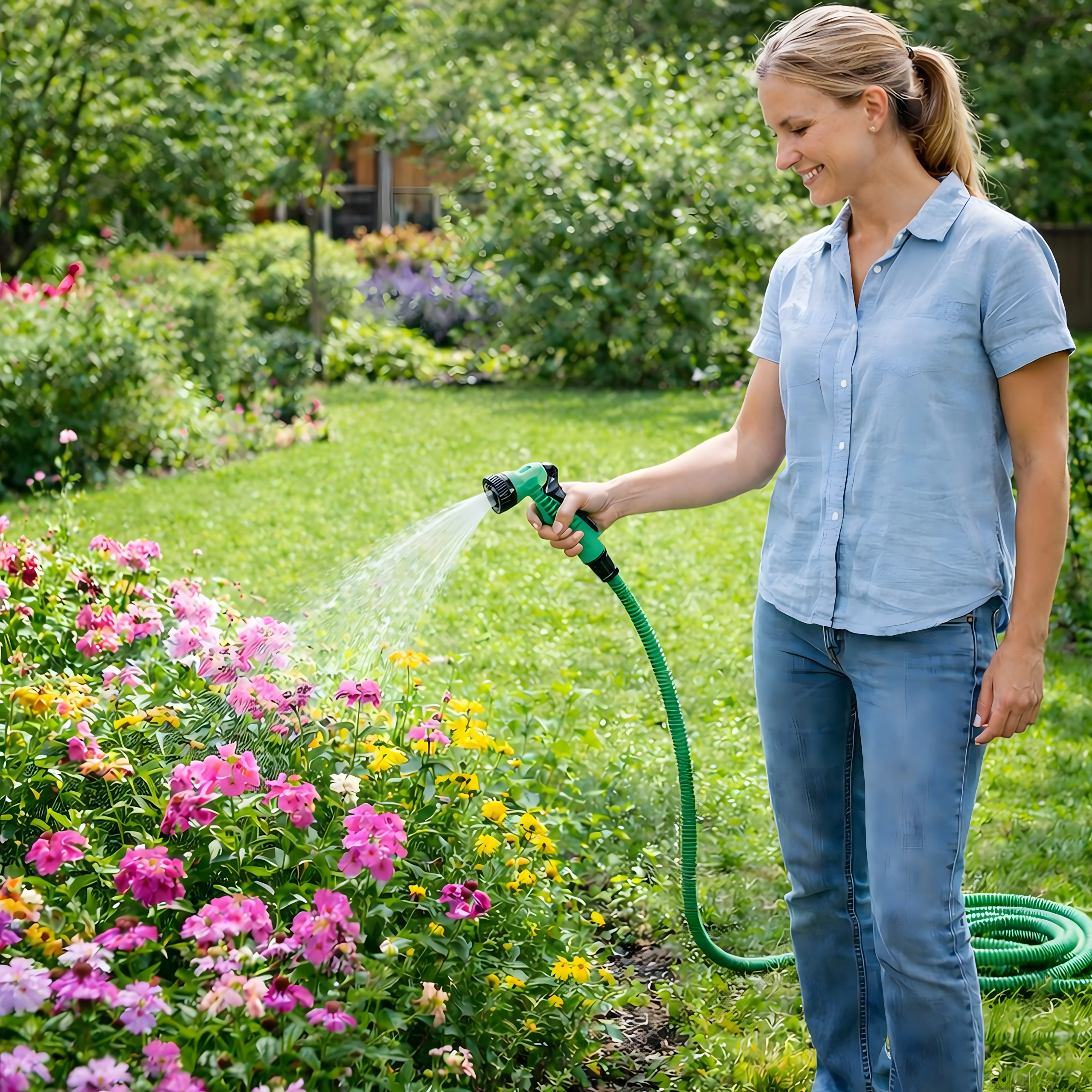 Les raccords rapides assurent une connexion rapide et étanche au robinet extérieur et aux accessoires. Le tuyau est parfait pour l’arrosage des fleurs et des pelouses, le rinçage des outils de jardin et le lavage de la voiture. Son faible poids et sa flexibilité garantissent une manipulation et un rangement faciles, même dans les petits espaces.