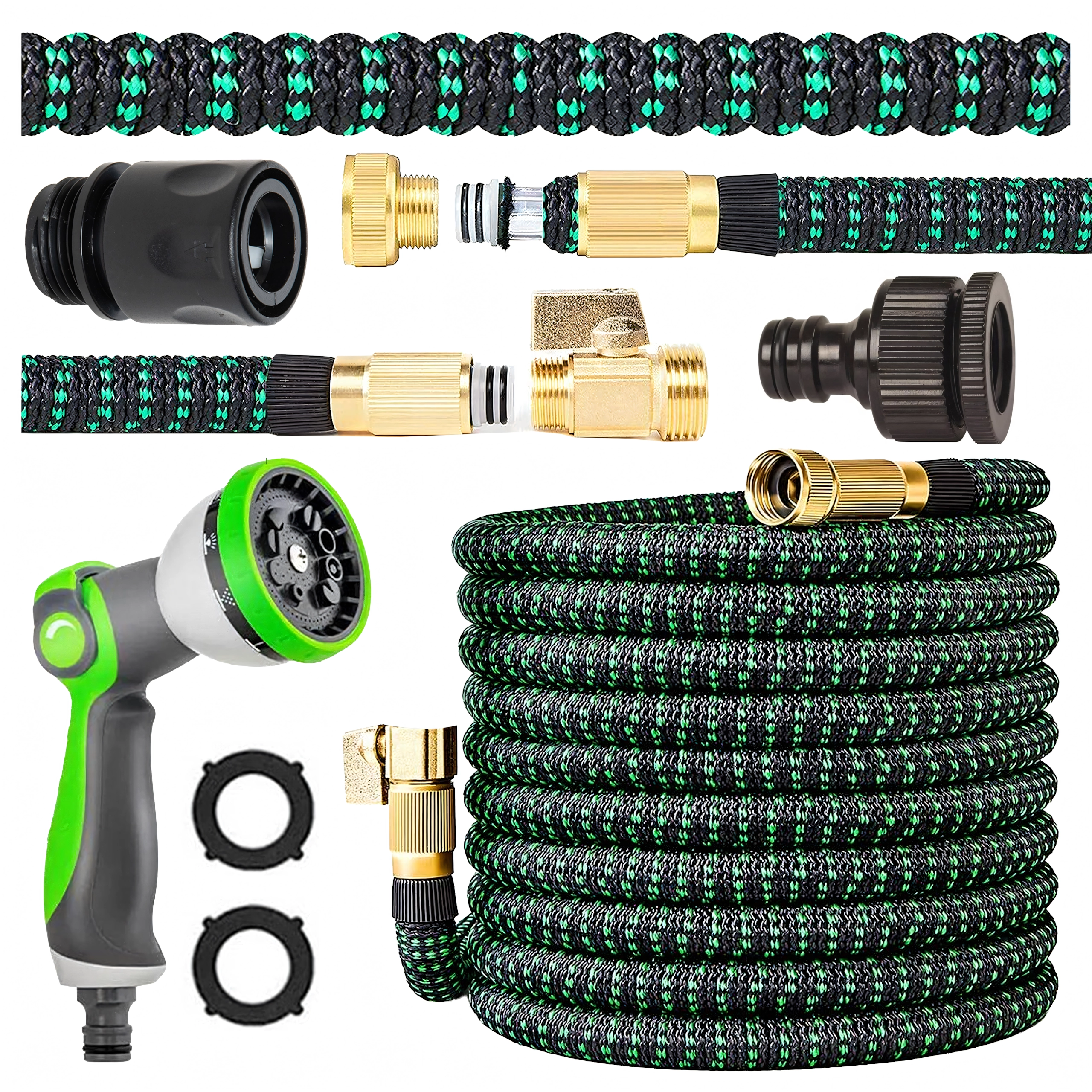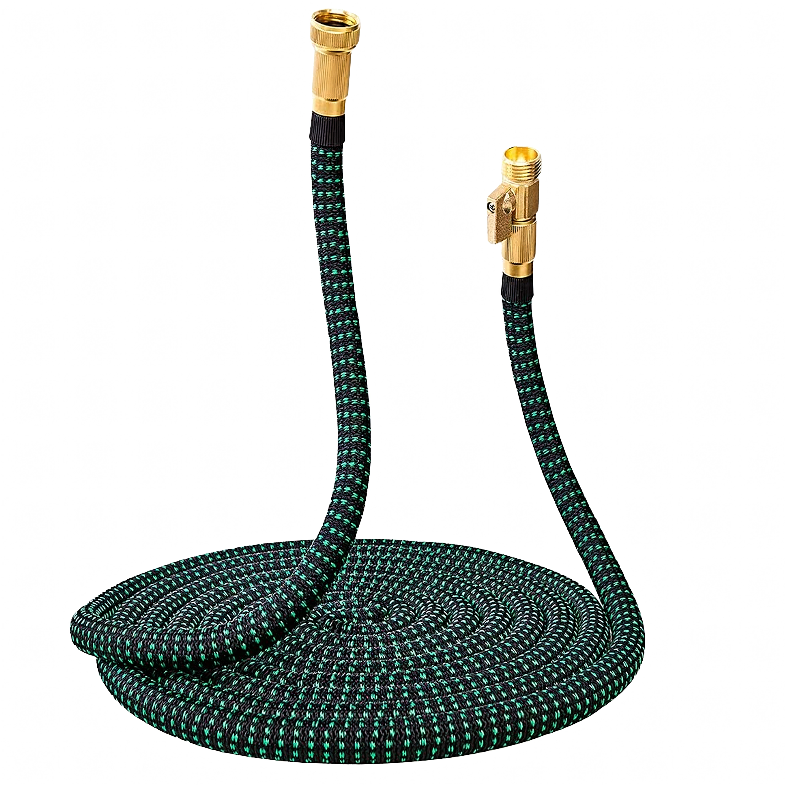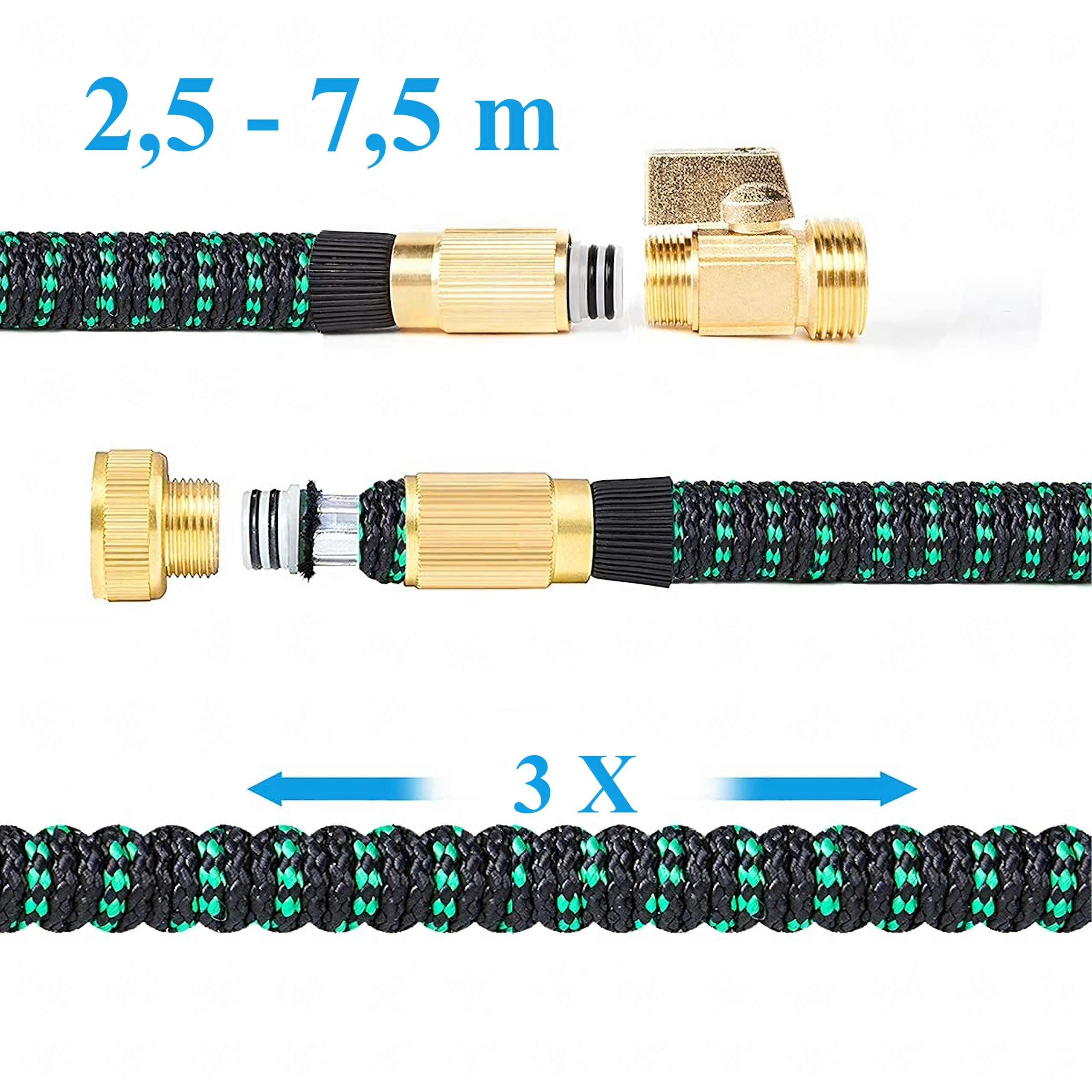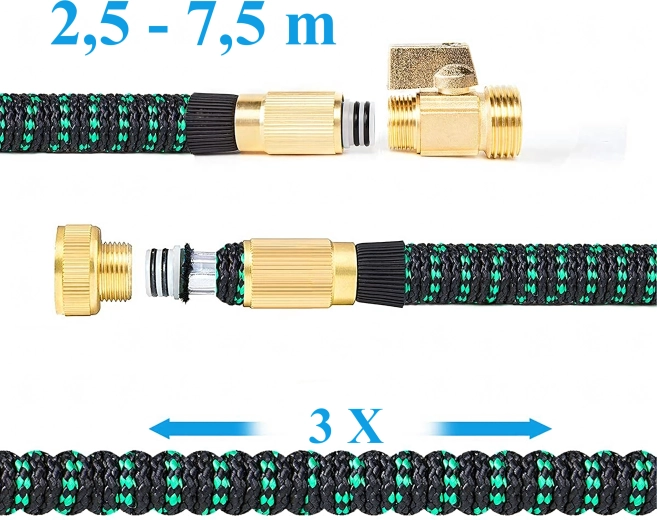 Tuyau d’arrosage extensible 2,5–7,5 m, compact et léger, avec connecteurs en laiton 1/2" et 3/4" et pistolet de pulvérisation multijets. Gaine textile résistante, protection anti-pliure et vanne d’arrêt pour arroser le jardin, laver la voiture et nettoyer autour de la maison en toute simplicité.