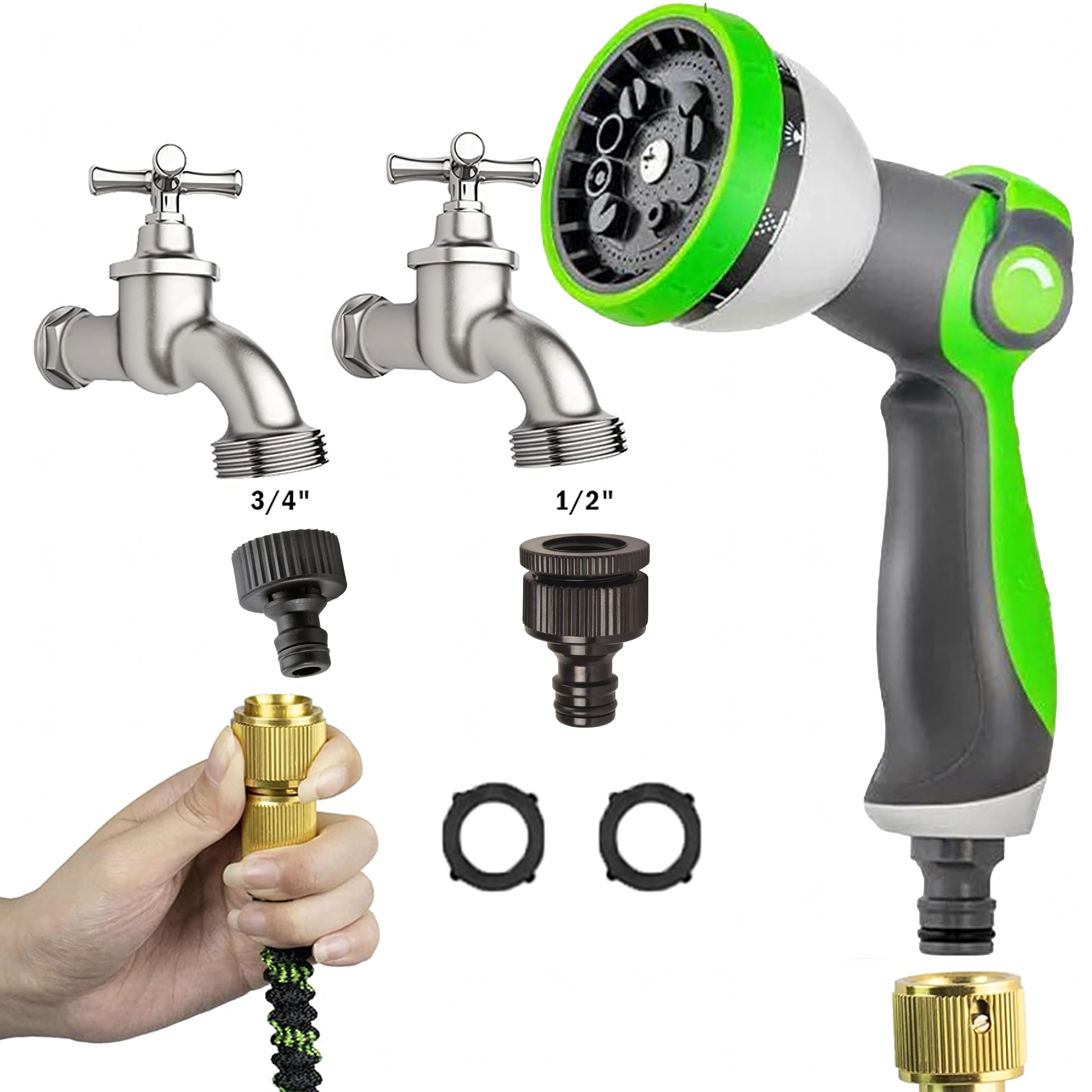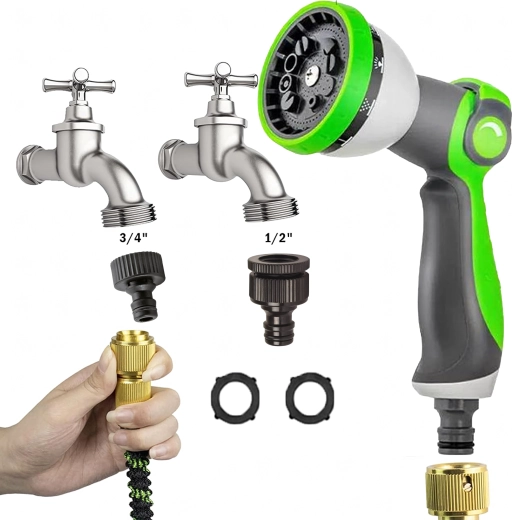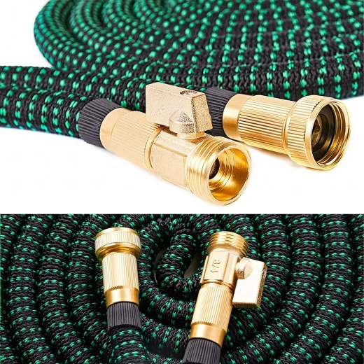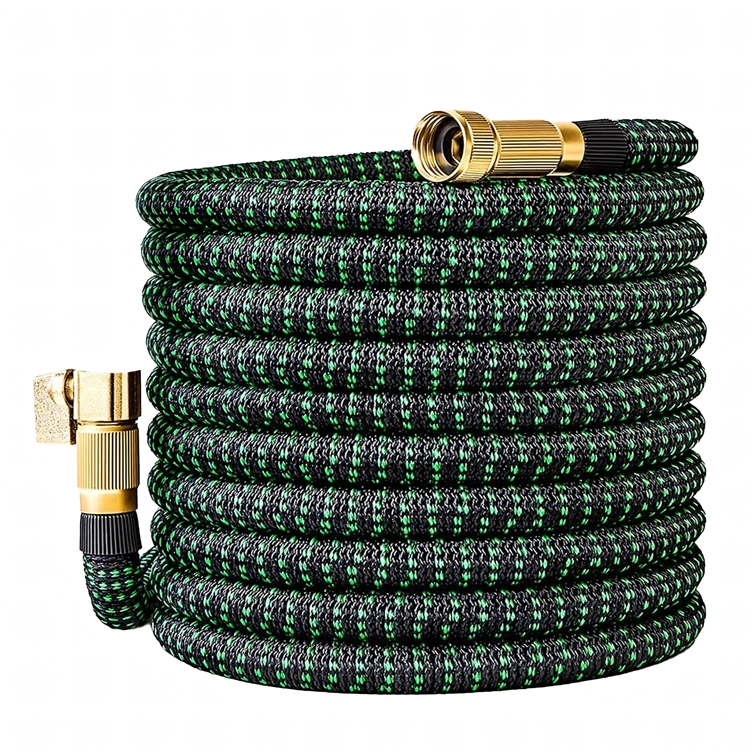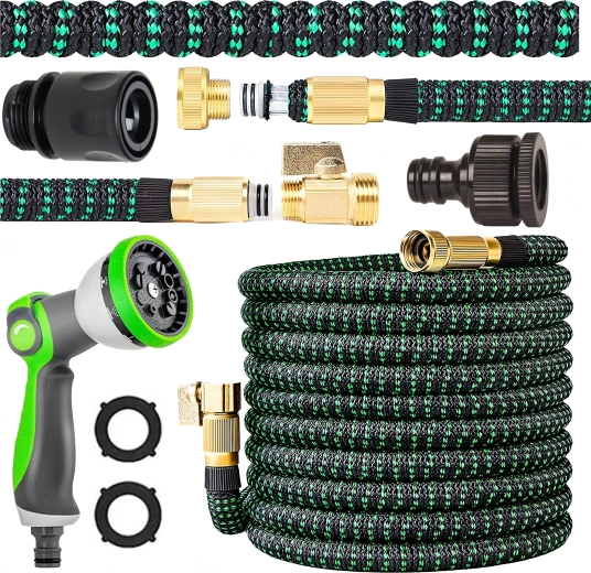 Tuyau d’arrosage extensible 2,5–7,5 m, compact et léger, avec connecteurs en laiton 1/2" et 3/4" et pistolet de pulvérisation multijets. Gaine textile résistante, protection anti-pliure et vanne d’arrêt pour arroser le jardin, laver la voiture et nettoyer autour de la maison en toute simplicité.