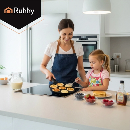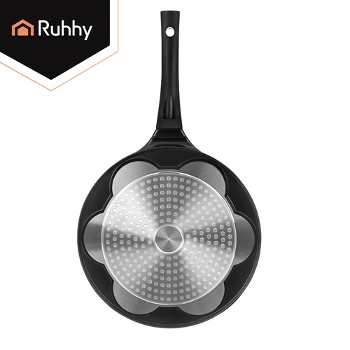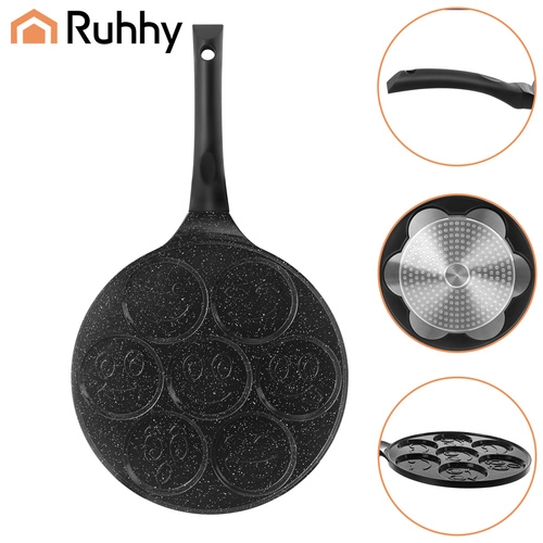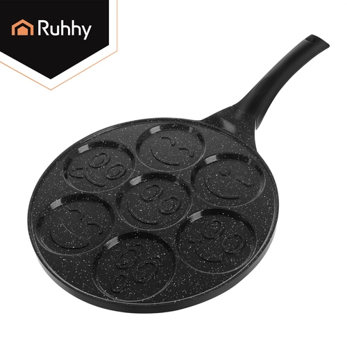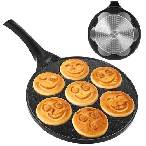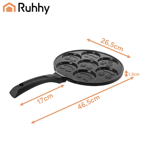 Égayez le petit-déjeuner avec la poêle RUHHY pour 7 mini pancakes aux visages souriants. Grâce au revêtement céramique antiadhésif sans PFOA, vous cuisinez avec un minimum de matière grasse, tandis que le fond à induction garantit une répartition uniforme de la chaleur. La poignée amovible et froide au toucher apporte sécurité et confort sur tous types de plaques de cuisson.