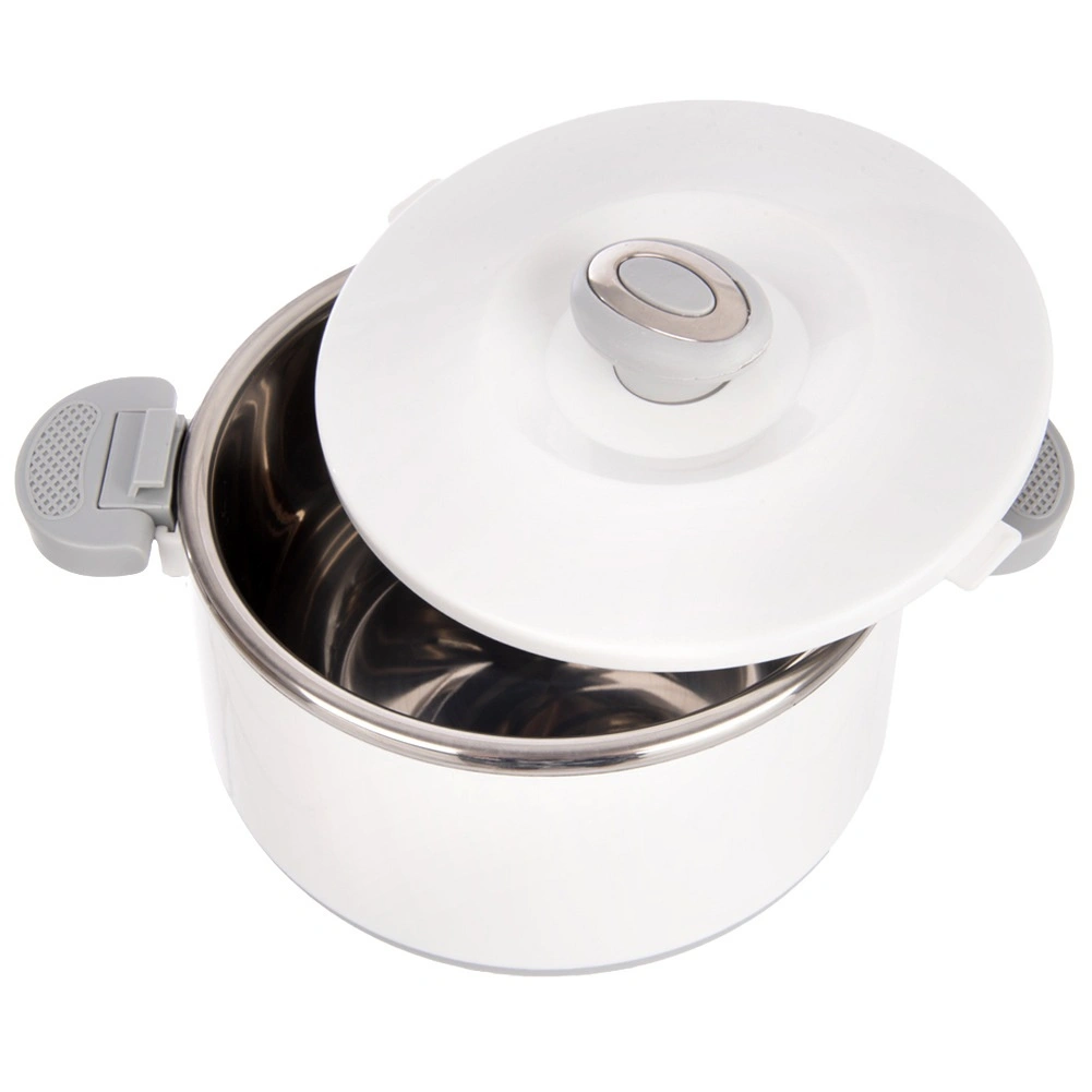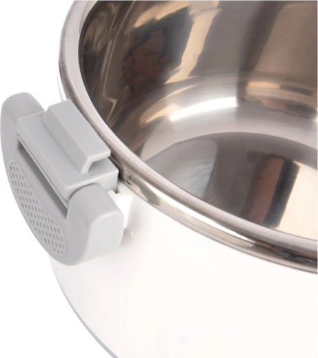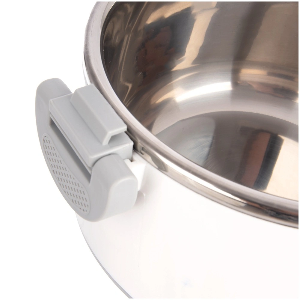 L’intérieur en acier inoxydable est lisse et facile à nettoyer, tandis que la coque extérieure en plastique blanc est légère et résistante à un usage quotidien.
