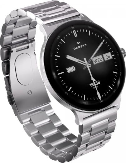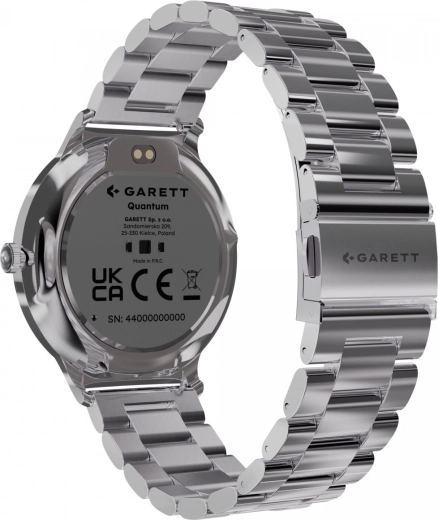 Élégante montre connectée GARETT Quantum associant un écran AMOLED 1,43" avec Always On Display, un verre Gorilla Glass résistant et une autonomie jusqu’à 7 jours. La boîte inclut un bracelet en acier et un bracelet en cuir pour changer facilement de style. La montre mesure la fréquence cardiaque, la tension artérielle, la SpO2, le sommeil et le stress, permet de téléphoner depuis votre poignet et est compatible Android et iOS via l’application Garett Smart.