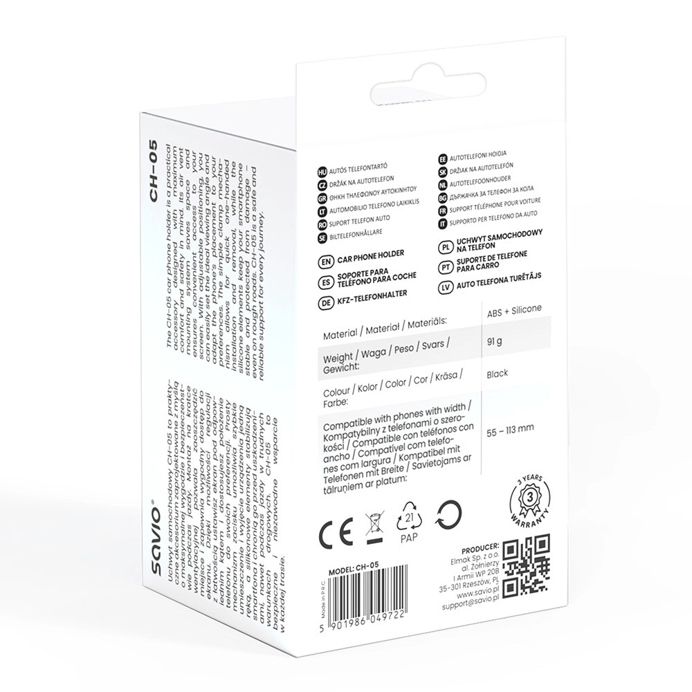 Le support de voiture SAVIO CH-05 se fixe directement sur la grille de ventilation, il ne bloque pas la vue et garde le téléphone toujours à portée de main. Il offre une installation rapide sans ventouses ni adhésif, une tête rotative pour une position verticale ou horizontale et une fixation sûre d’une seule main grâce aux inserts en silicone. Compatible avec la plupart des smartphones d’une largeur de 55 à 113 mm.
