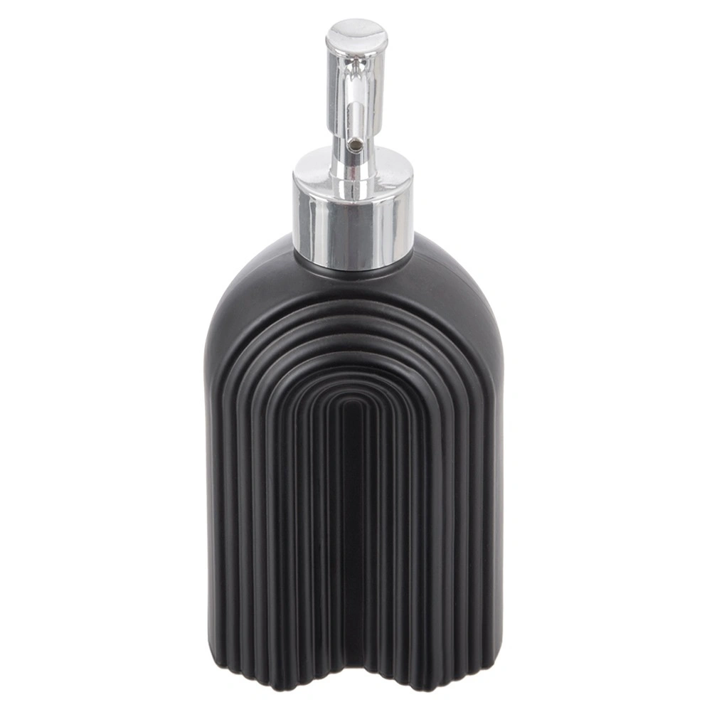 Distributeur stylé en verre de qualité, en noir mat, offrant une allure intemporelle et une utilisation pratique pour l’entretien quotidien de la maison. La forme arquée nervurée du flacon assure une prise ferme et sert d’élément décoratif, tandis que la pompe à l’aspect métallique brillant délivre le savon ou la crème avec précision et sans gaspillage.
