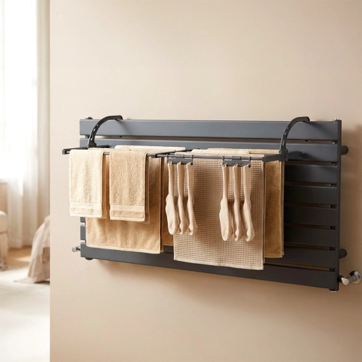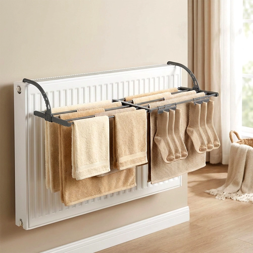 • Gain de place : montage sur radiateur ou garde-corps, design pliant compact.