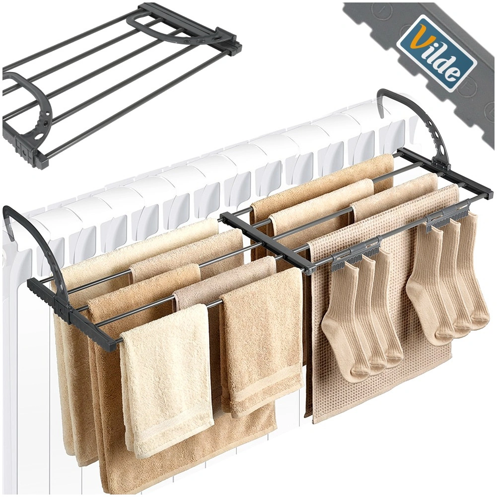 • Flexibilité : largeur extensible en continu 68,5–123 cm, écartement des crochets réglable par rapport au radiateur.
