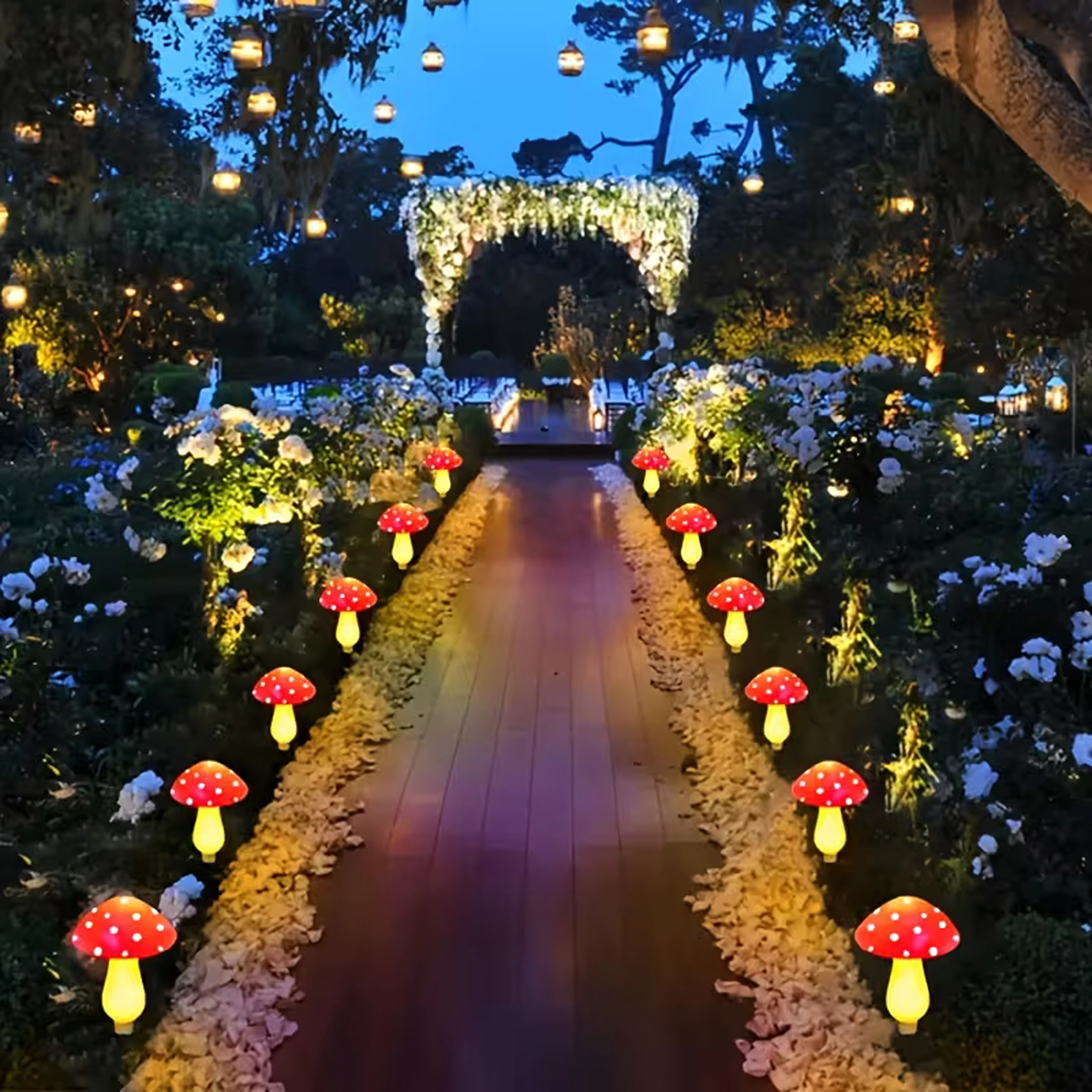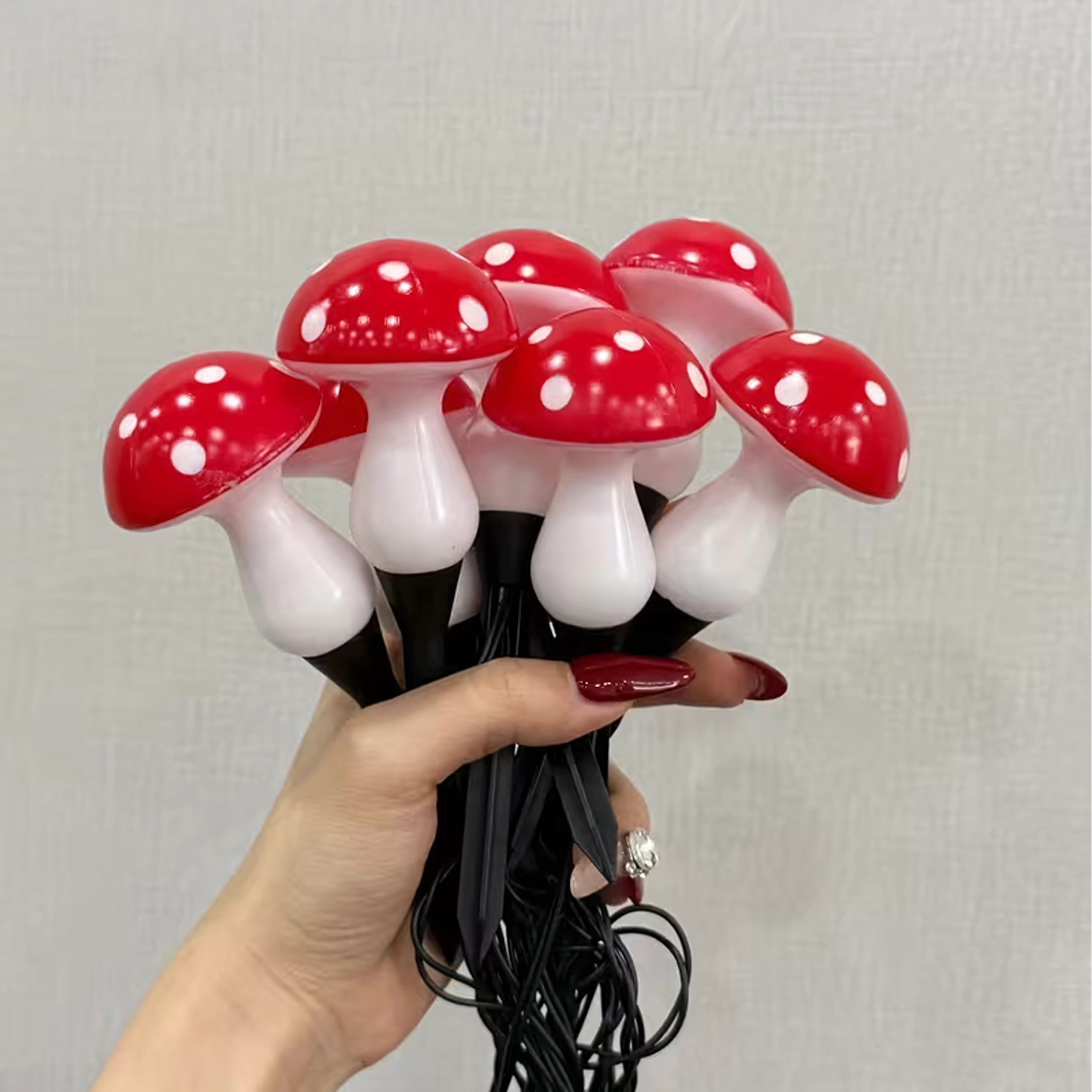 - Design enchanteur : chapeaux rouges à pois blancs et lueur jaune chaleureuse
