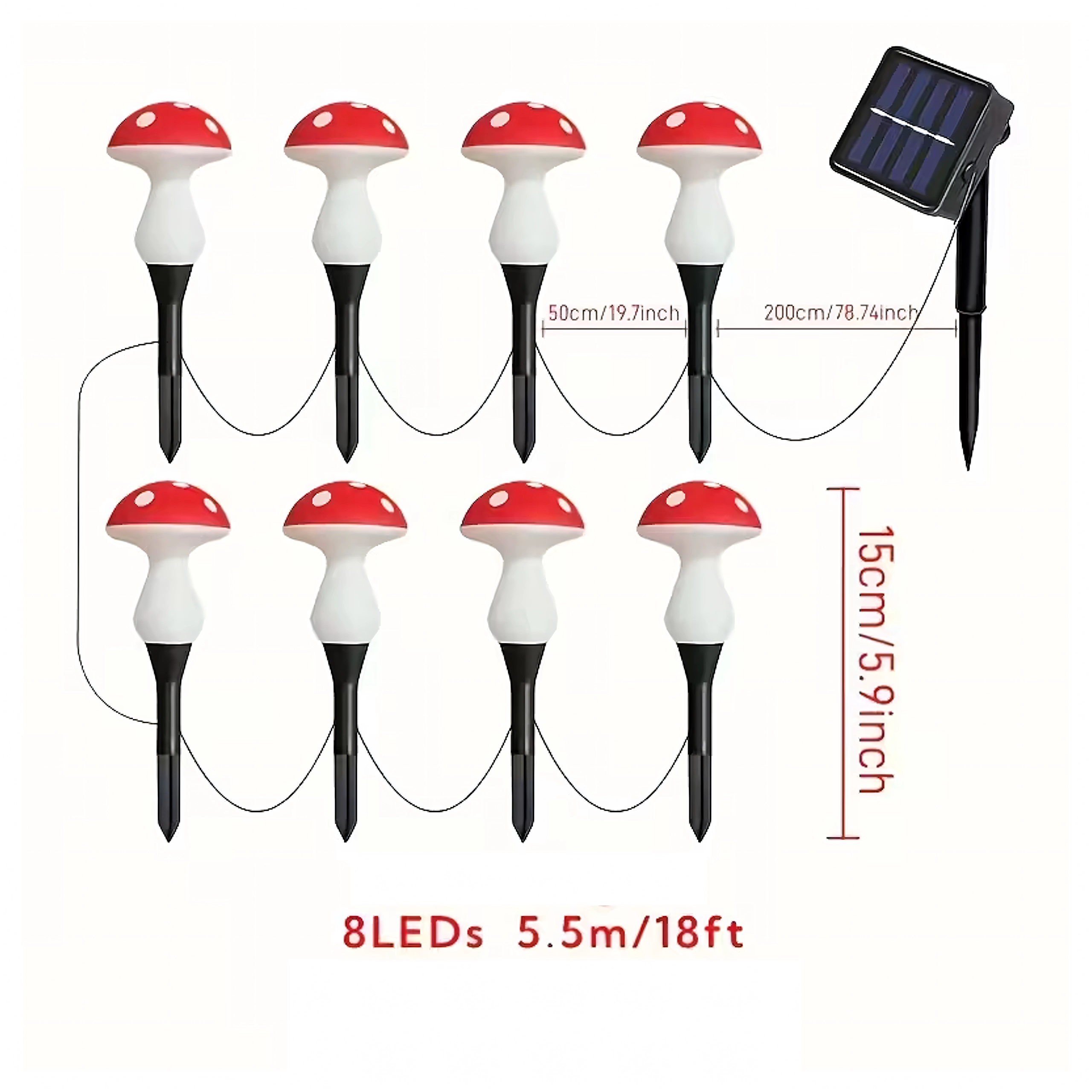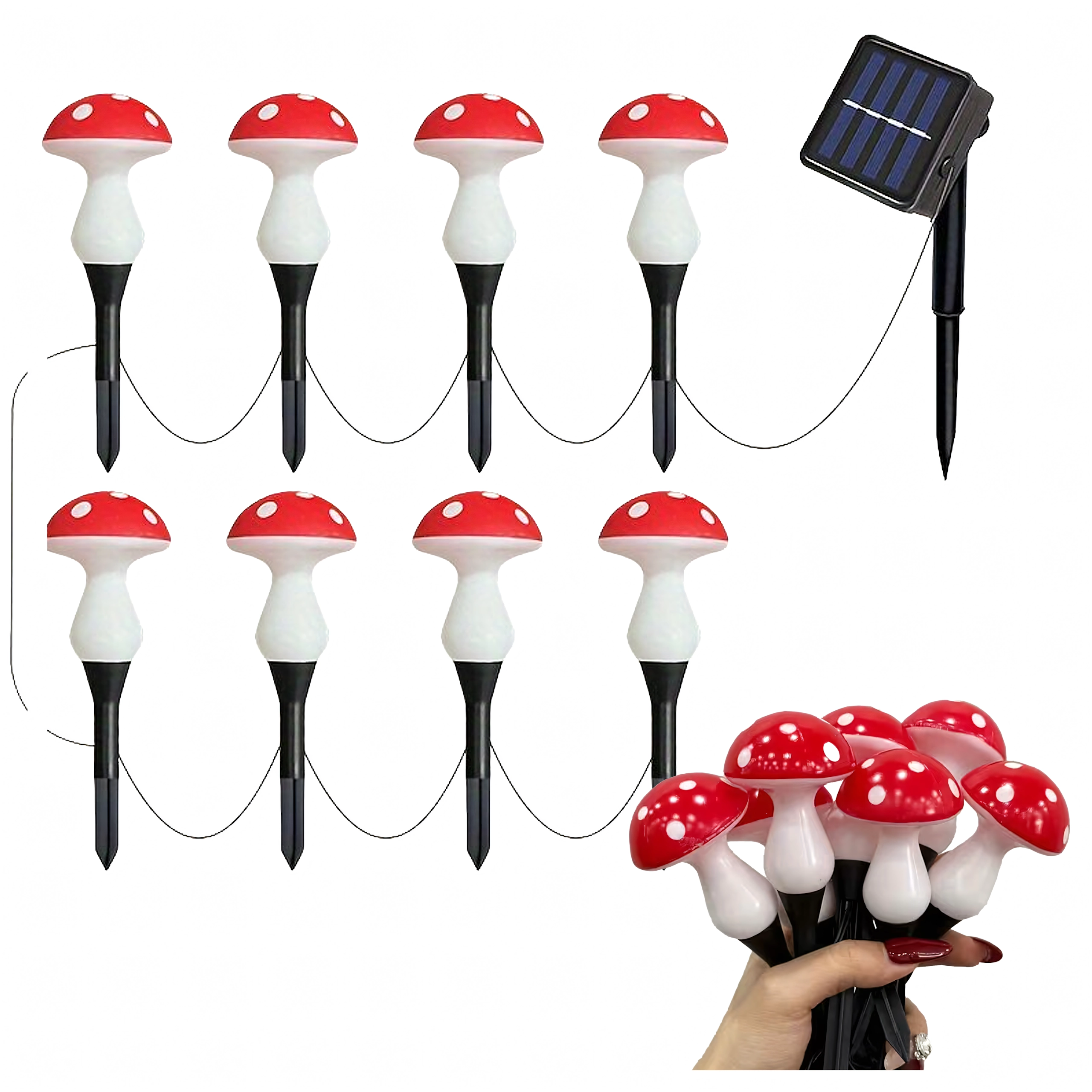Illuminez massifs, allées et jardinières avec de petites lumières féeriques en forme d’amanites. Cet ensemble comprend 8 lampes LED solaires sur un câble de 5,5 m offrant une lueur chaude et agréable, un allumage automatique à la tombée de la nuit et une résistance à l’usage extérieur – sans branchement secteur et sans souci.