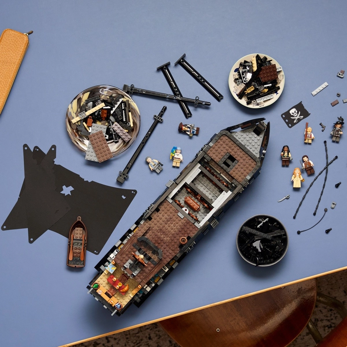 Profitez d’éléments interactifs : faites tourner les molettes de commande pour déployer les canons à bâbord comme à tribord, manœuvrez le gouvernail, ouvrez le pont et explorez la cabine du capitaine. La coque peut être séparée au niveau de la ligne de flottaison pour une présentation dynamique « en mode navigation ». Sont incluses 8 minifigurines : Jack Sparrow, Will Turner, Gibbs, Cotton, Anamaria, Marty, Elizabeth Swann et Hector Barbossa.