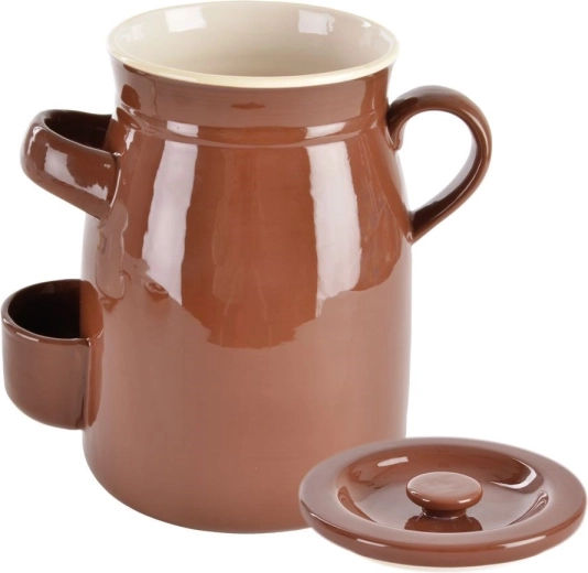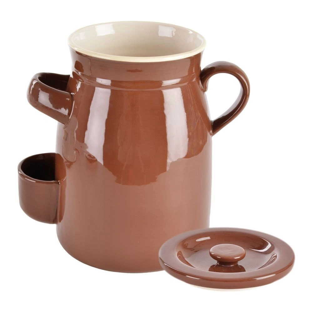 Pot de fermentation compact en céramique de 2,5 l avec couvercle étanche à l’air, poignées pratiques et pinces en bois pour retirer facilement les aliments. La céramique émaillée de couleur brune maintient une température stable et protège le contenu de la lumière, favorisant ainsi la fermentation optimale des légumes, fromages ou poissons en saumure, au sel ou au vinaigre.