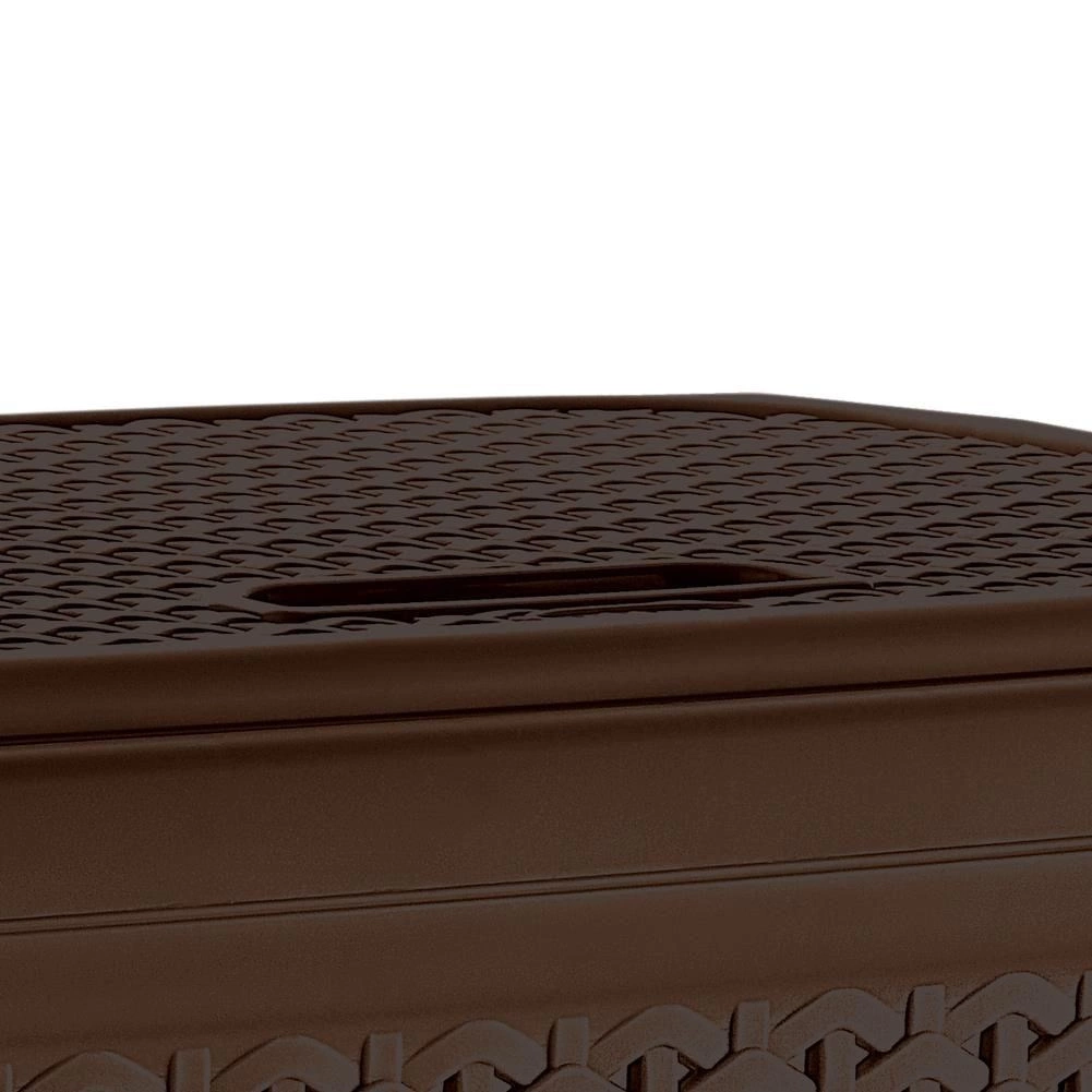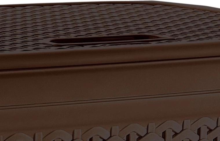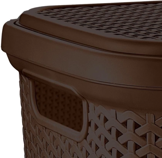 Le panier est fabriqué en plastique léger et durable de couleur brune, facile à assortir à la plupart des intérieurs. Son format étroit permet de gagner de la place – idéal à côté de la machine à laver ou dans un coin. Les poignées latérales intégrées garantissent un transport confortable.