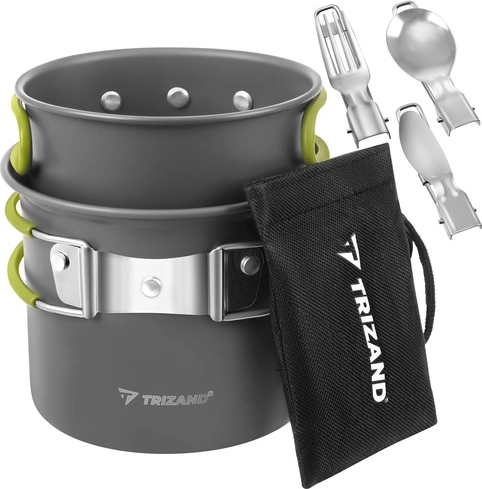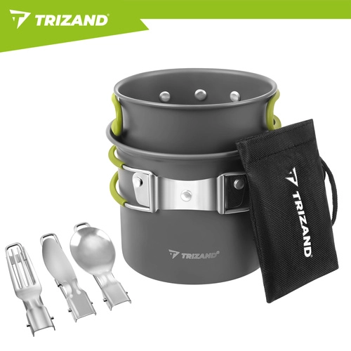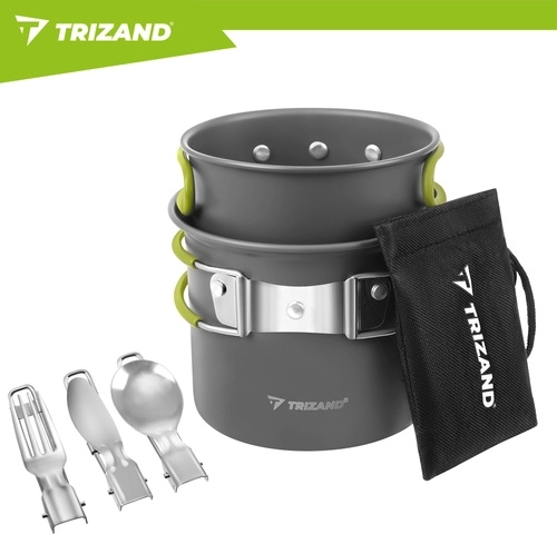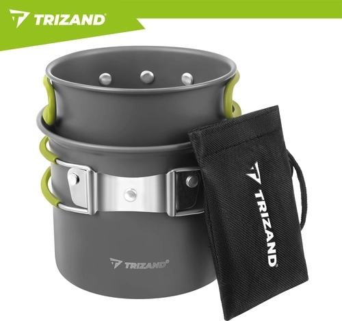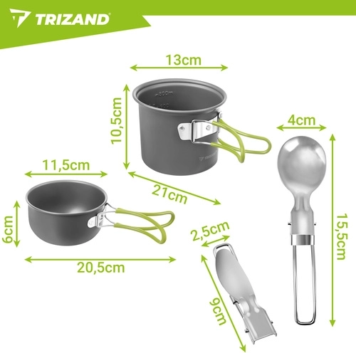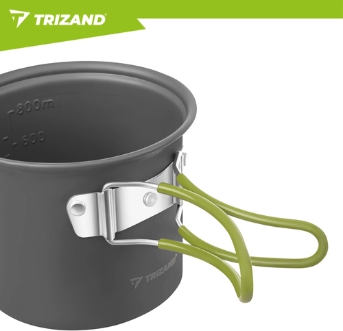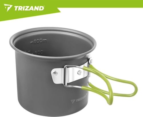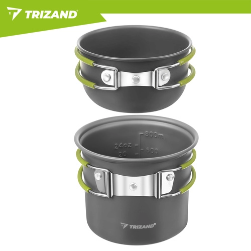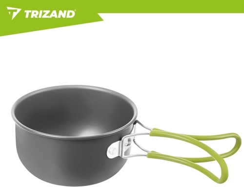 Le set de vaisselle pratique TRIZAND est fabriqué en alliage d’aluminium résistant (épaisseur 0,8 mm) pour une cuisson efficace en plein air. Les dimensions compactes de la casserole et du bol/poêle avec couvercle économisent de la place dans le sac à dos, tandis que les poignées ergonomiques pliables avec mécanisme de verrouillage assurent une prise en main sûre sans risque de brûlure.